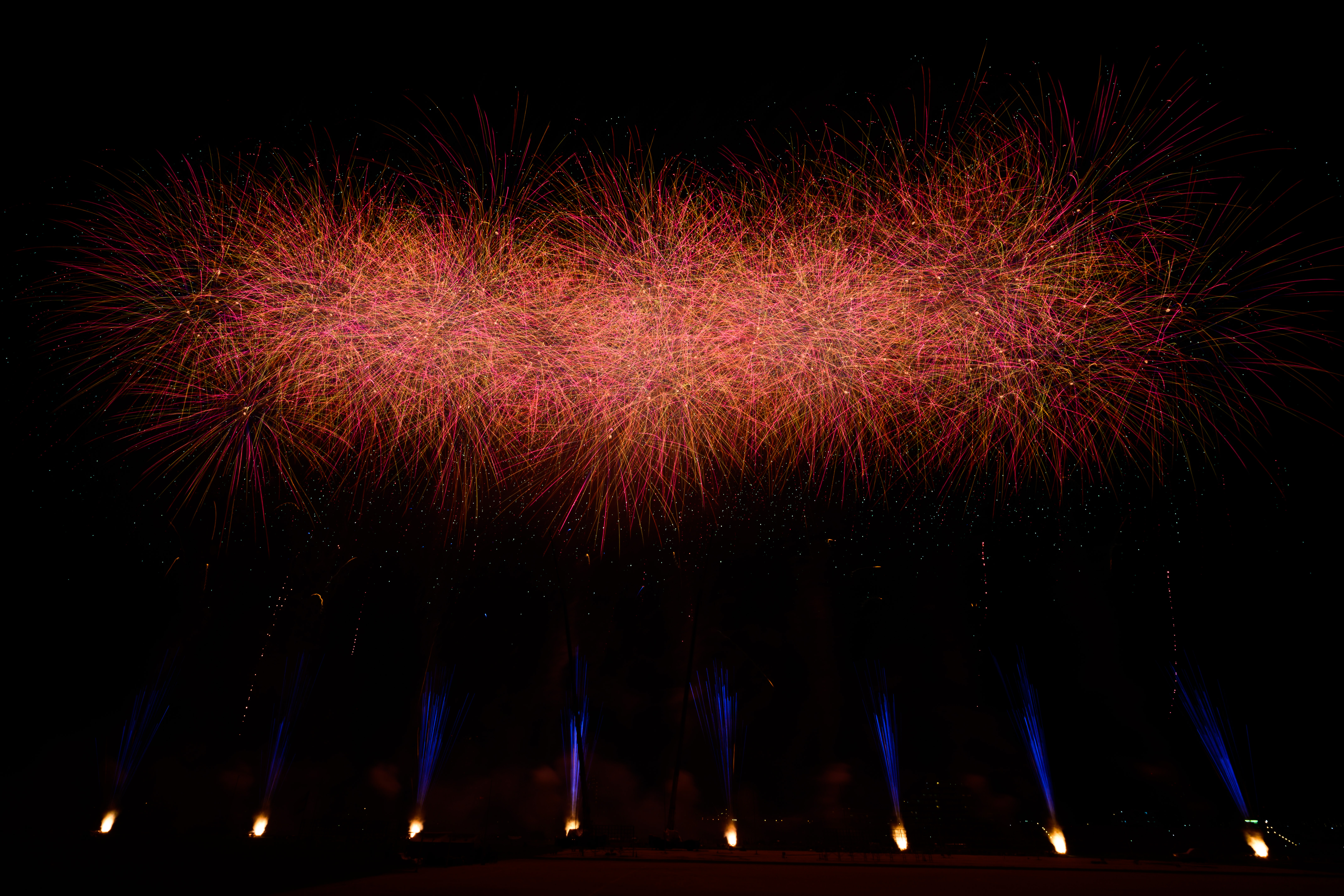 夜空に炸裂する赤いスターマインの写真素材です。暗闇に広がる赤い光跡が放射状に広がり、複数の発光点から鮮烈な光が四方に飛び散る瞬間を捉えた一枚です。花火大会の記事や夏のイベント素材、演出効果の表現などにおすすめです。