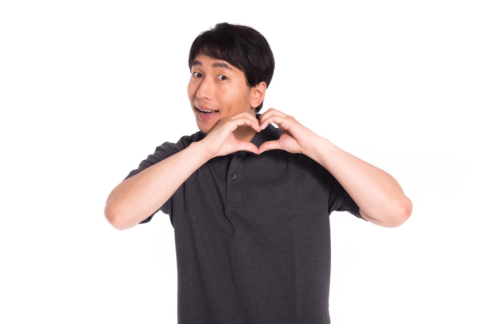 両手でハートマークを作る男性の写真素材です。黒髪の男性が両手の指を組み合わせてハート形を作り、笑顔で幸せな表情を浮かべています。恋愛やラブ関連のWebサイト、バレンタインデーやホワイトデーのキャンペーン素材、SNS投稿などにおすすめです。