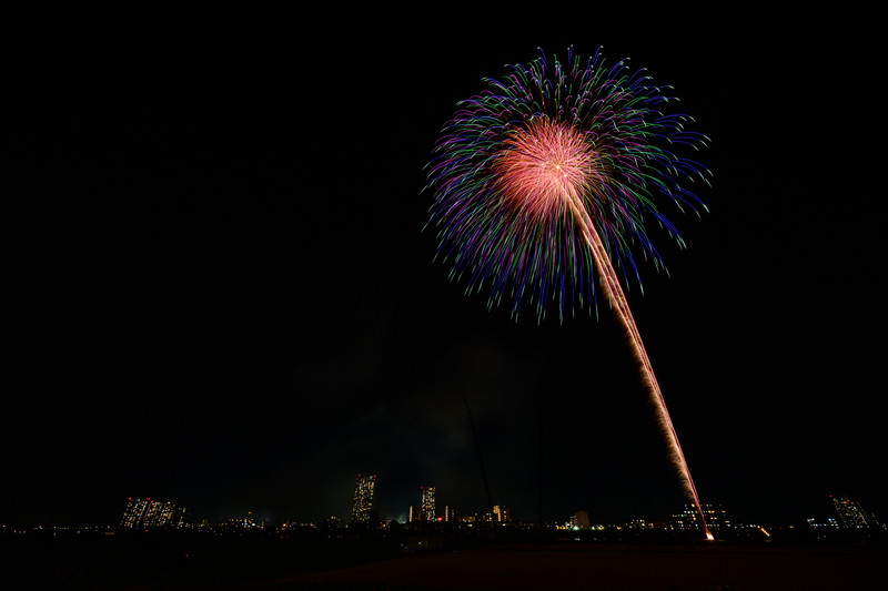 都会の夜空に打ち上がる花火の写真素材です。暗闇の中で色とりどりの花火が大きく開き、光の軌跡が弧を描いており、スターマインやスパークなど複数の花火が同時に上がっている光景。花火大会のポスターやイベント告知、夜景関連のコンテンツ制作にご活用いただけます。