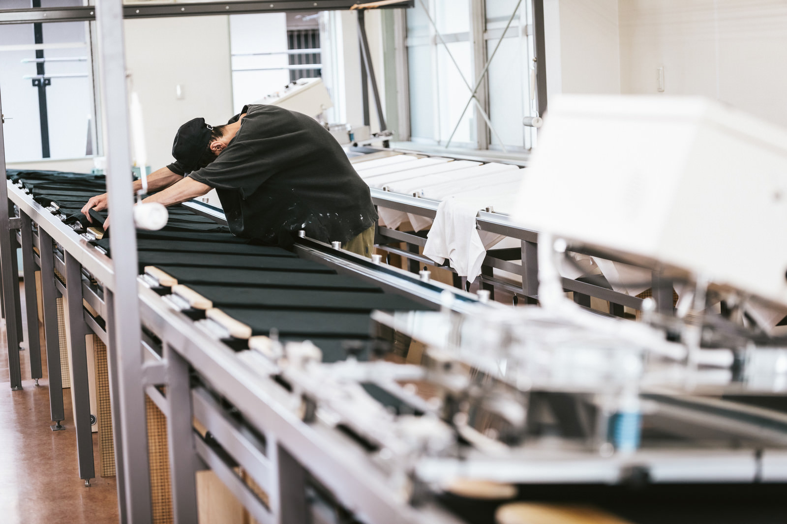シルク印刷台にTシャツを並べて位置合わせをする職人の写真素材です。長台に配置された黒いTシャツを丁寧に調整し、印刷前の正確な位置決めを行う職人の手作業風景を捉えています。印刷業界の製造現場や職人技術の紹介、ものづくりコンテンツなどにおすすめです。