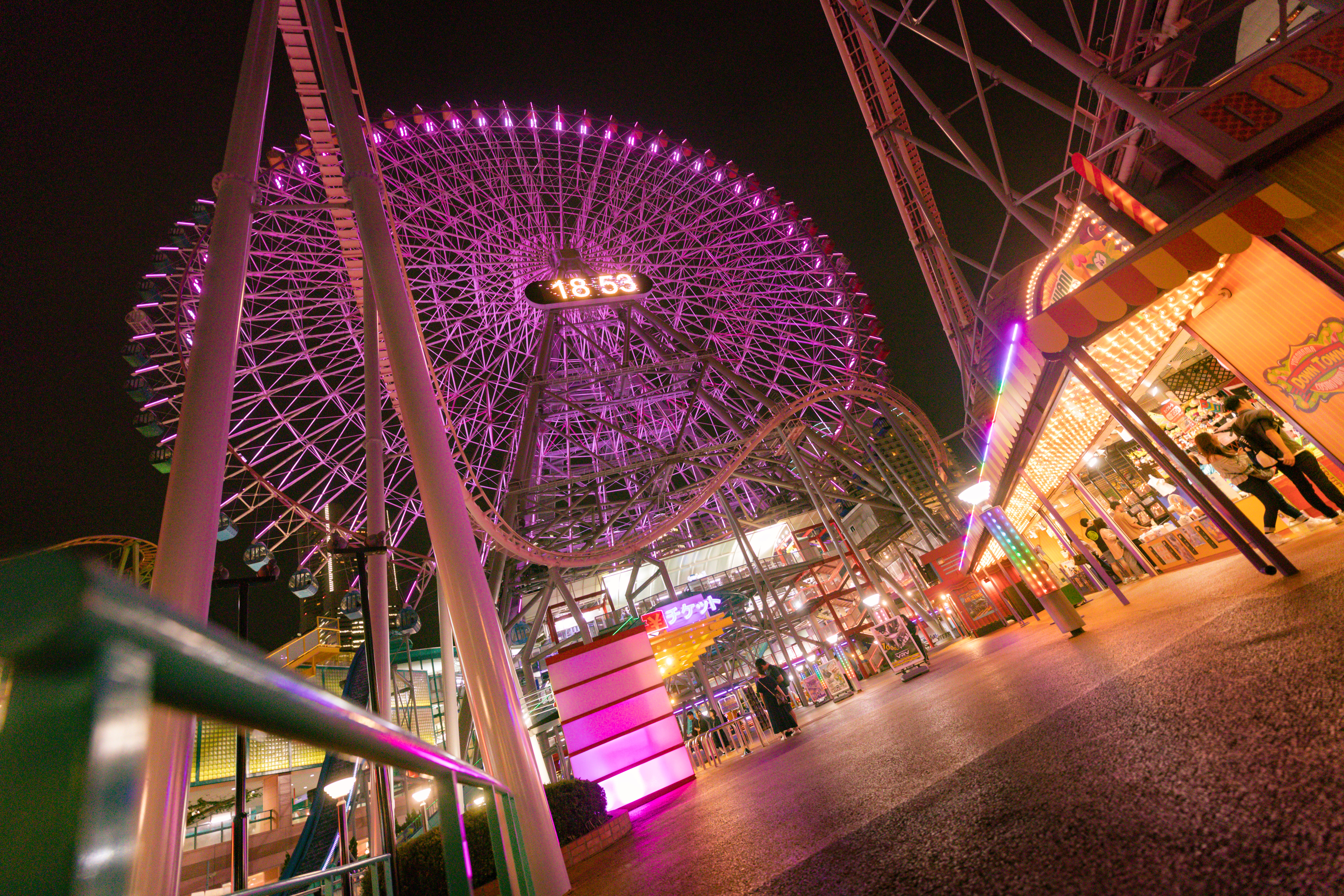 横浜みなとみらいの夜のコスモワールドと観覧wheel の写真素材です。色とりどりにライトアップされた大観覧車と周辺の遊園地施設が夜空に浮かび上がり、横浜を代表する夜景スポットとして輝いています。横浜観光やデートスポット紹介、夜景関連のWebサイトやブログなどにおすすめです。