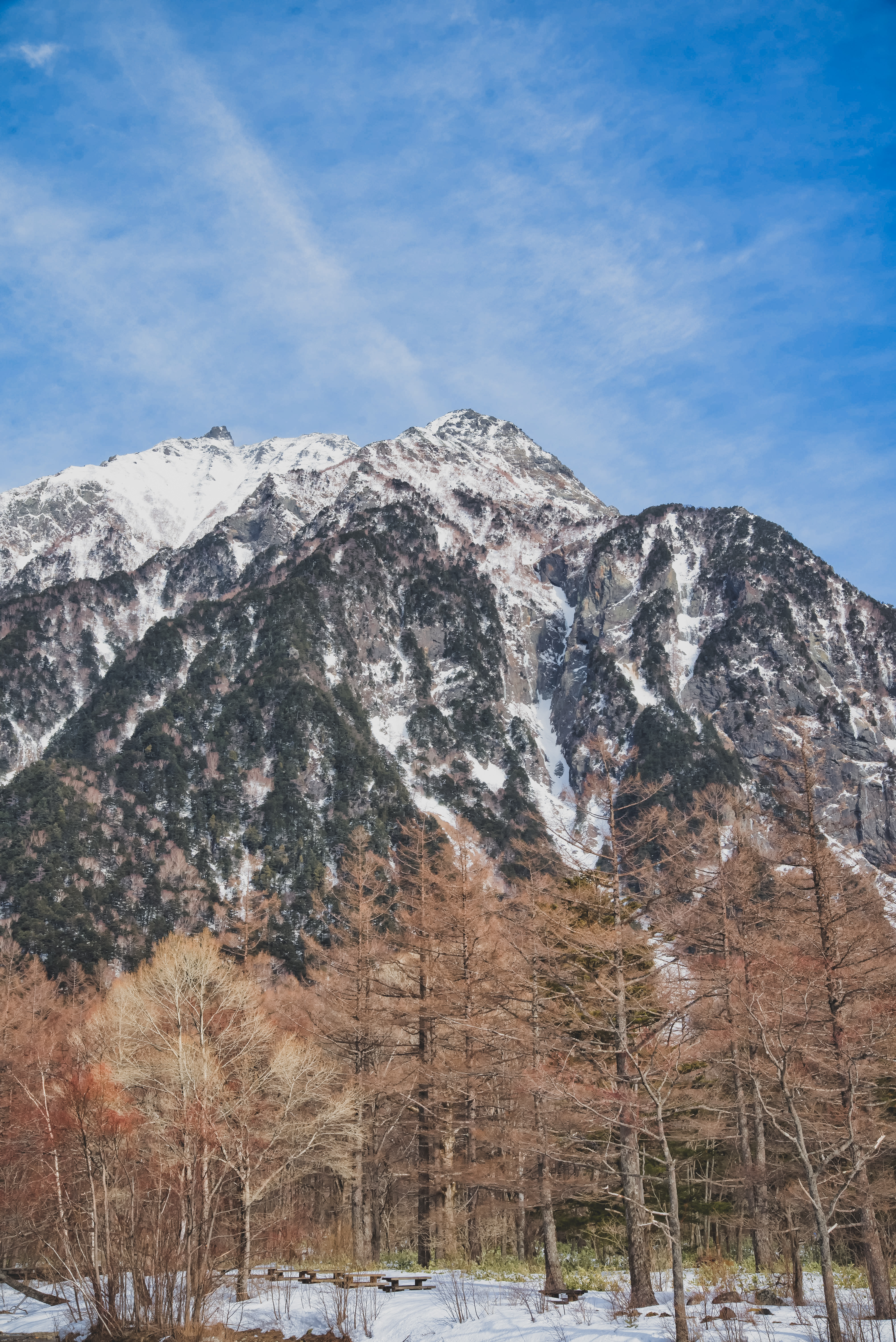 冬の明神岳を麓の落葉樹の森越しに撮影した写真素材です。葉が落ちた茶色の木々の向こうに雪をかぶった峰が立ち、地面にも雪が積もっている。冬山登山や季節の自然風景の素材としておすすめです。