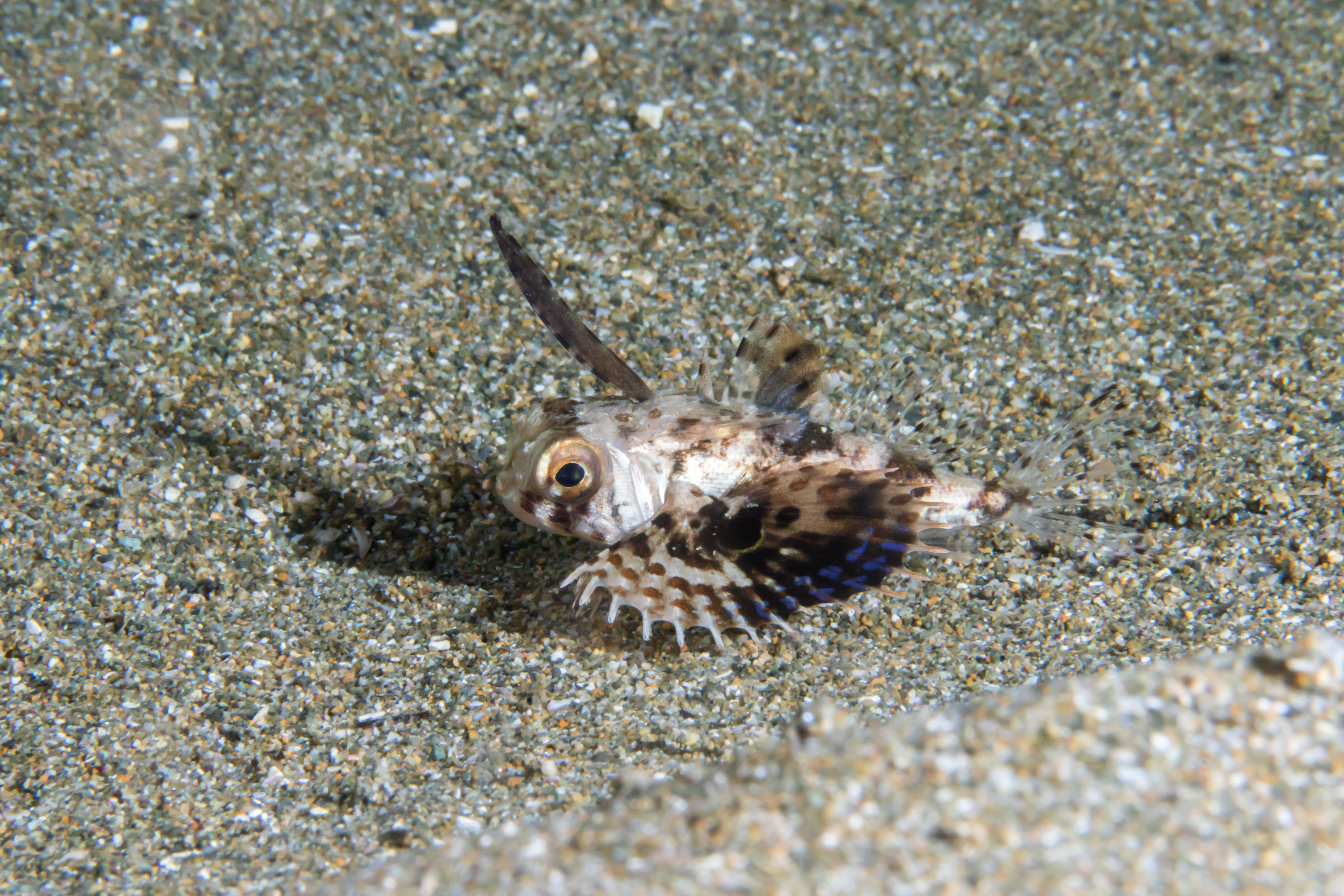 Juvenile Helmet Gurnard with Free Spines Peeking from Sandy Burrow