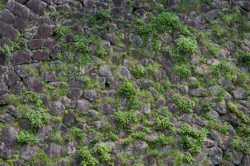 石垣の隙間から草が生える写真素材です。グレーの石と石の間から緑の雑草が芽生えており、季節の経過とともに自然が形成する風景を捉えています。テクスチャーやバナー背景として活用できます。