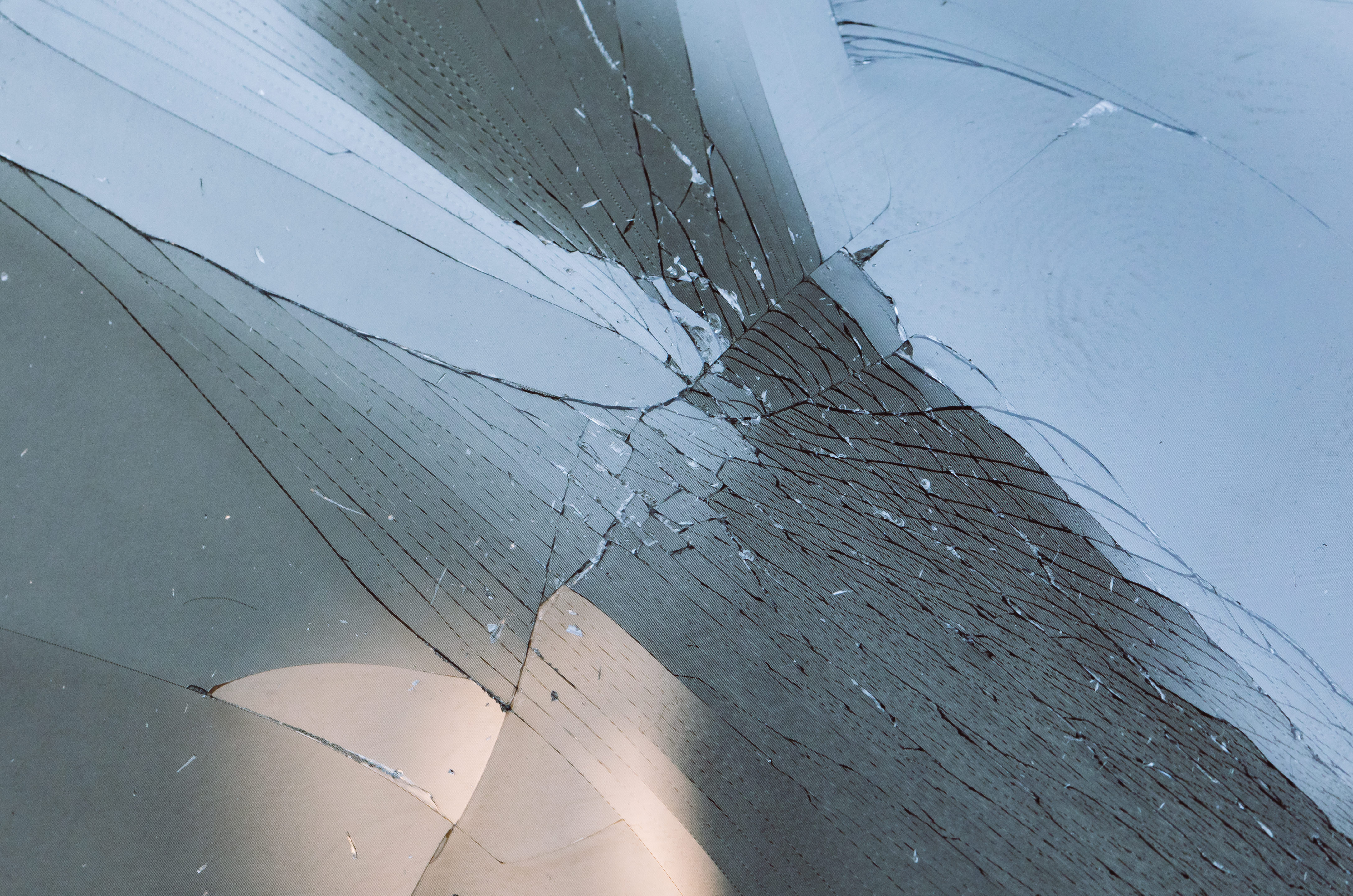 ひび割れたガラスの写真素材です。透明なガラス表面に細かなクラックが入り、放射状に広がる破損パターンと複数方向に伸びた線状の割れが見られます。テクスチャー素材として高い表現力があり、デザインのアクセントや破損表現などにおすすめです。