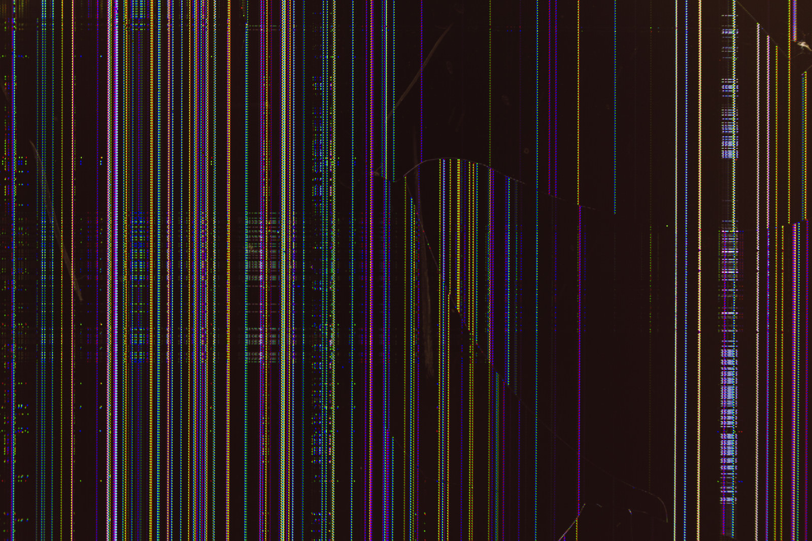 液晶モニターが壊れた状態を記録した写真素材です。画面には縦に走る多色のラインノイズとドット抜けが広がり、ヒビ割れも見られます。デジタル機器の故障やエラー画面を示す資料・プレゼンテーションにおすすめです。