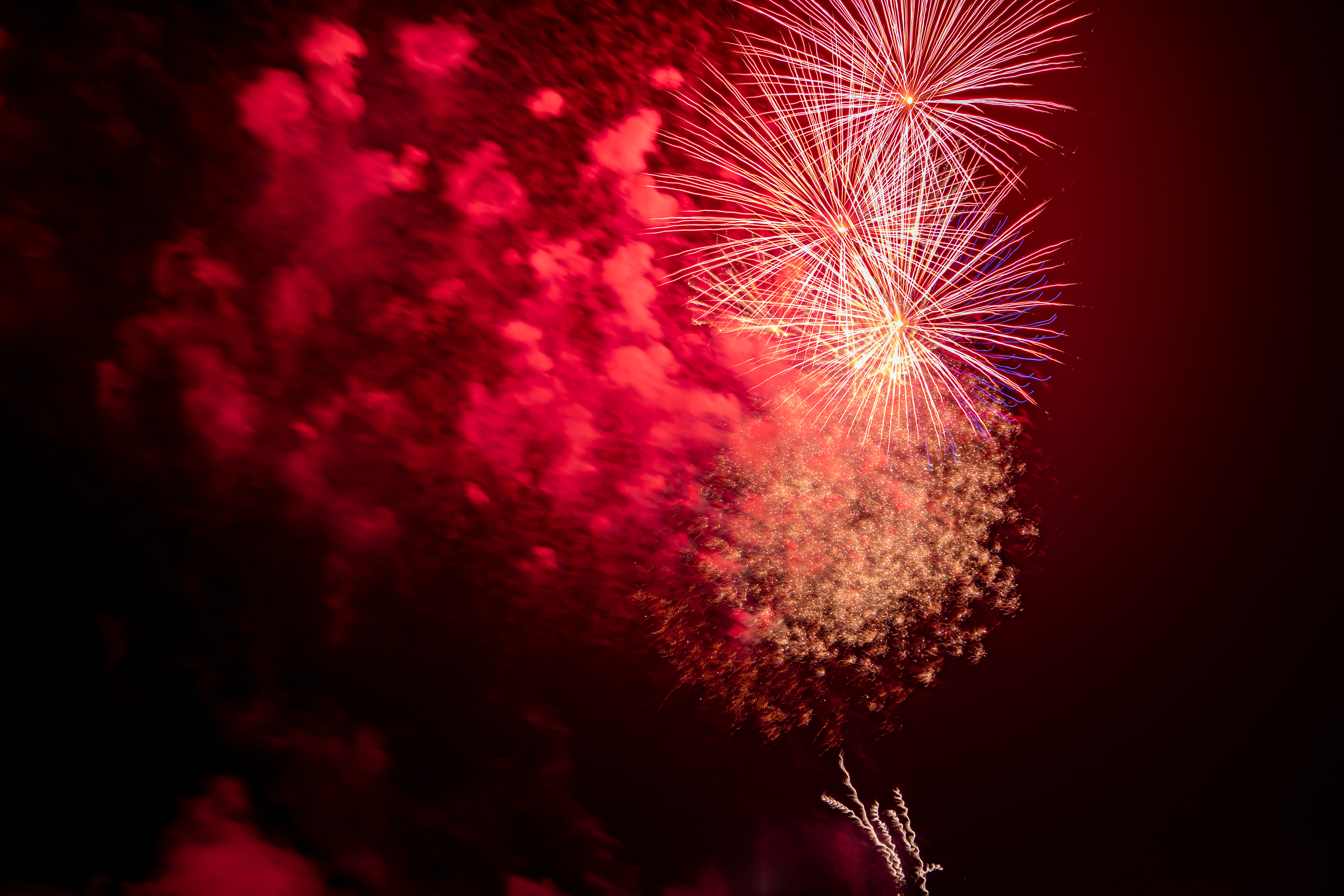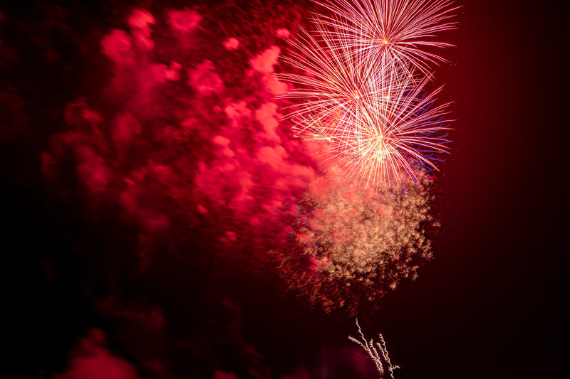 夜空に打ち上がる花火の写真素材です。赤い光を放ちながら炸裂する花火と、その周りに立ち込める白い煙が美しく写っており、花火大会の告知やイベント宣伝に最適です。季節素材やポスター制作などの幅広い用途に活用できます。