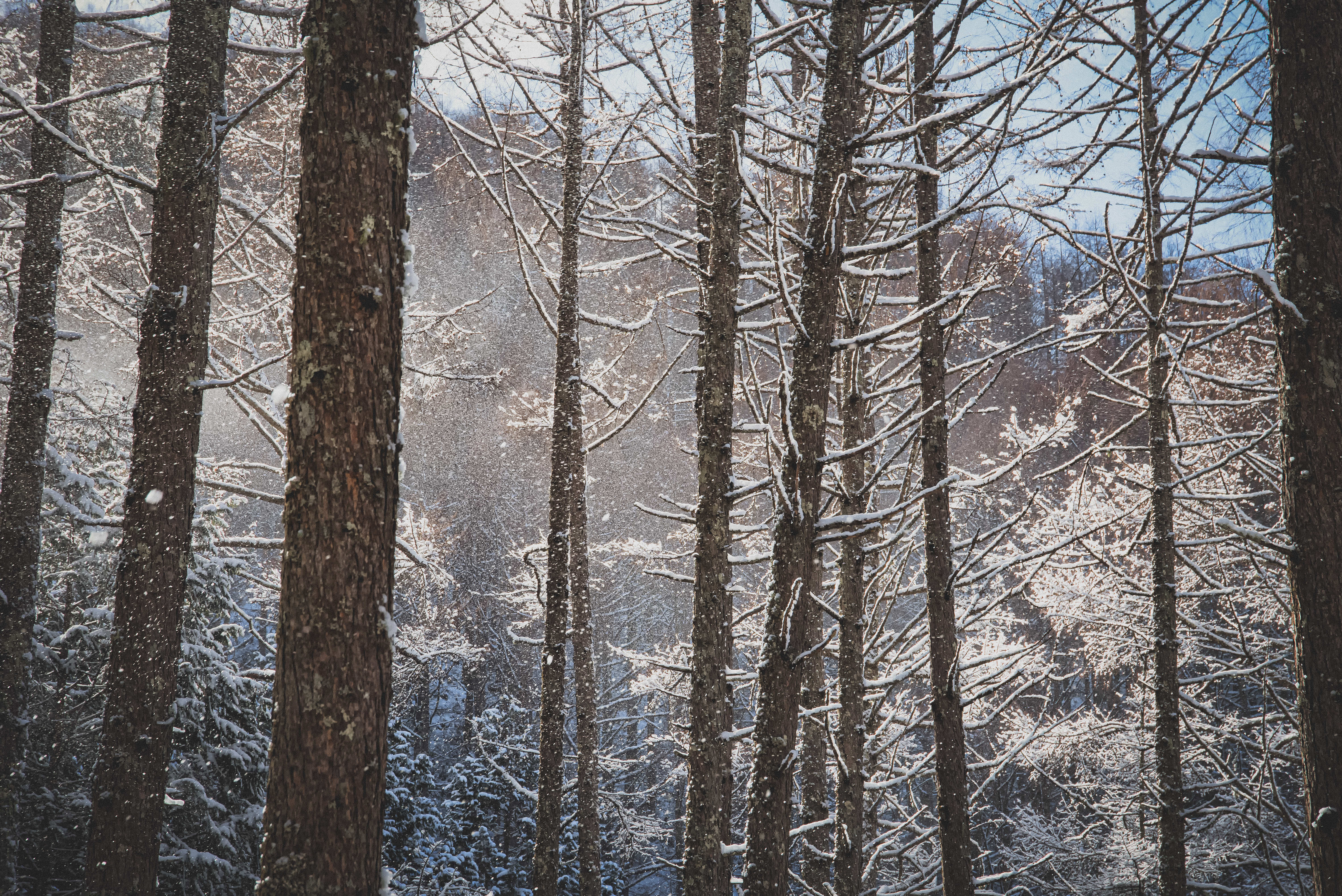 雪が降る冬の森で、枝に雪を載せた木々が立ち並ぶ写真素材です。手前の幹にピントが合い、奥に青空がわずかに見える。冬の自然風景や季節素材としておすすめです。