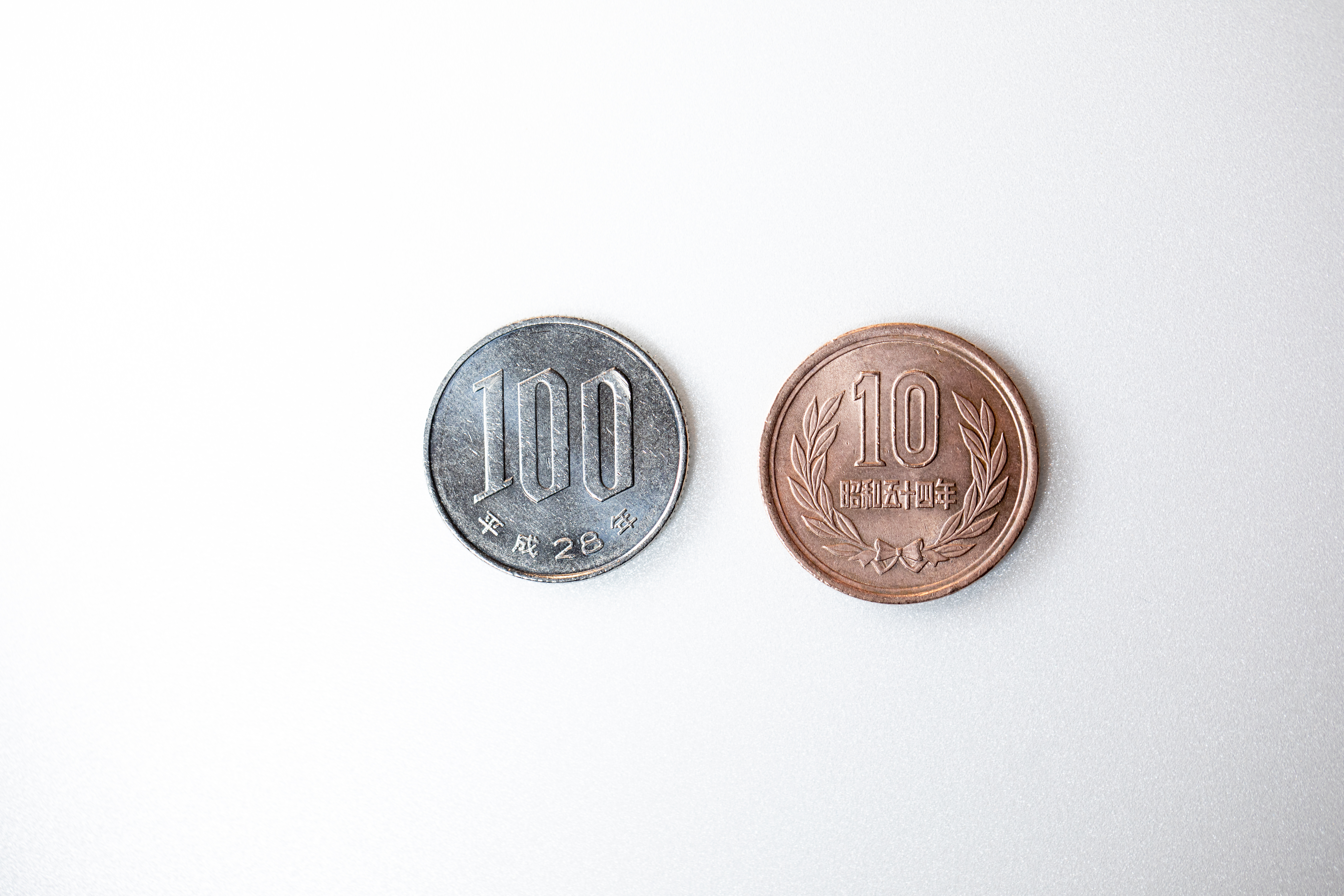 消費税10%になった時の100円玉と10円玉の写真素材です。白い背景に銀色の100円硬貨と銅色の10円硬貨が並んで置かれており、消費税率変更に伴う小銭の価値変動を表現しています。消費税や金銭管理、経済関連の記事制作やブログ、教育コンテンツなどにおすすめです。