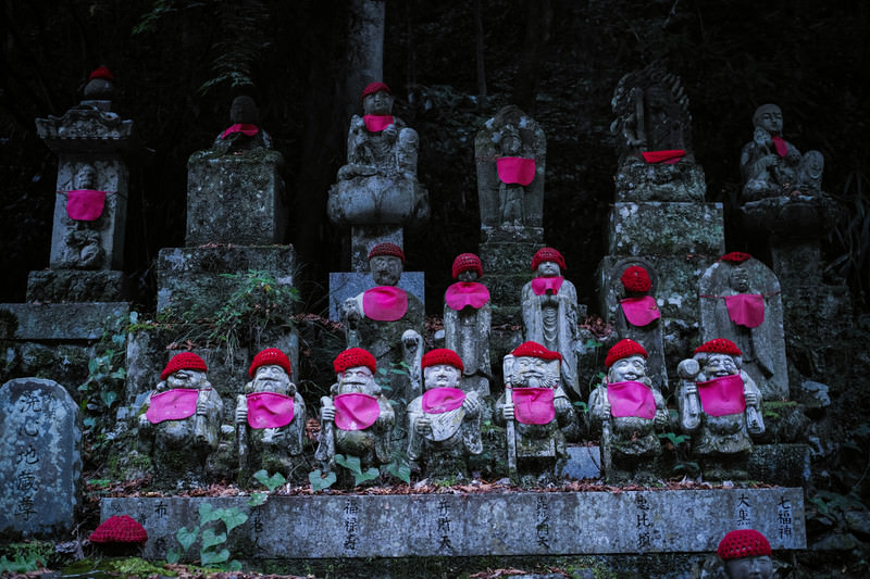 森の中に複数のお地蔵様が並んでいる写真素材です。各石像に赤い頭巾と前掛けが着せられ、苔の付いた石の表面が古さを伝えている。寺社仏閣や日本の伝統文化を扱ったWebサイト・資料制作におすすめです。