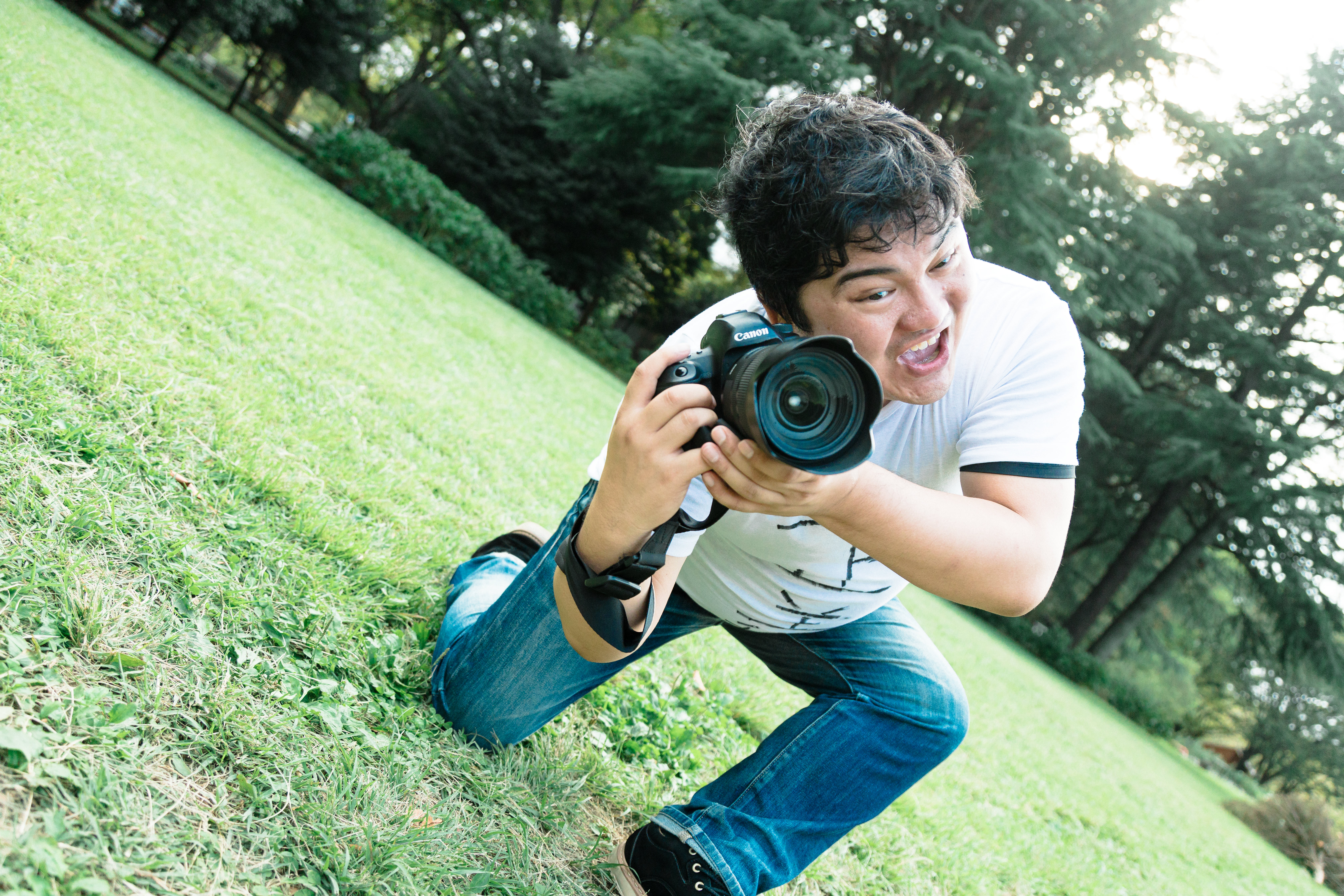 撮影会中に大声でポージングの指示を出すカメコの写真素材です。白いTシャツを着たメタボ体型の男性がローアングルからカメラを構えて撮影している姿が写っています。芝生の公園で撮影している様子が捉えられており、SNS投稿やWebコンテンツ、ブログ記事などにおすすめです。