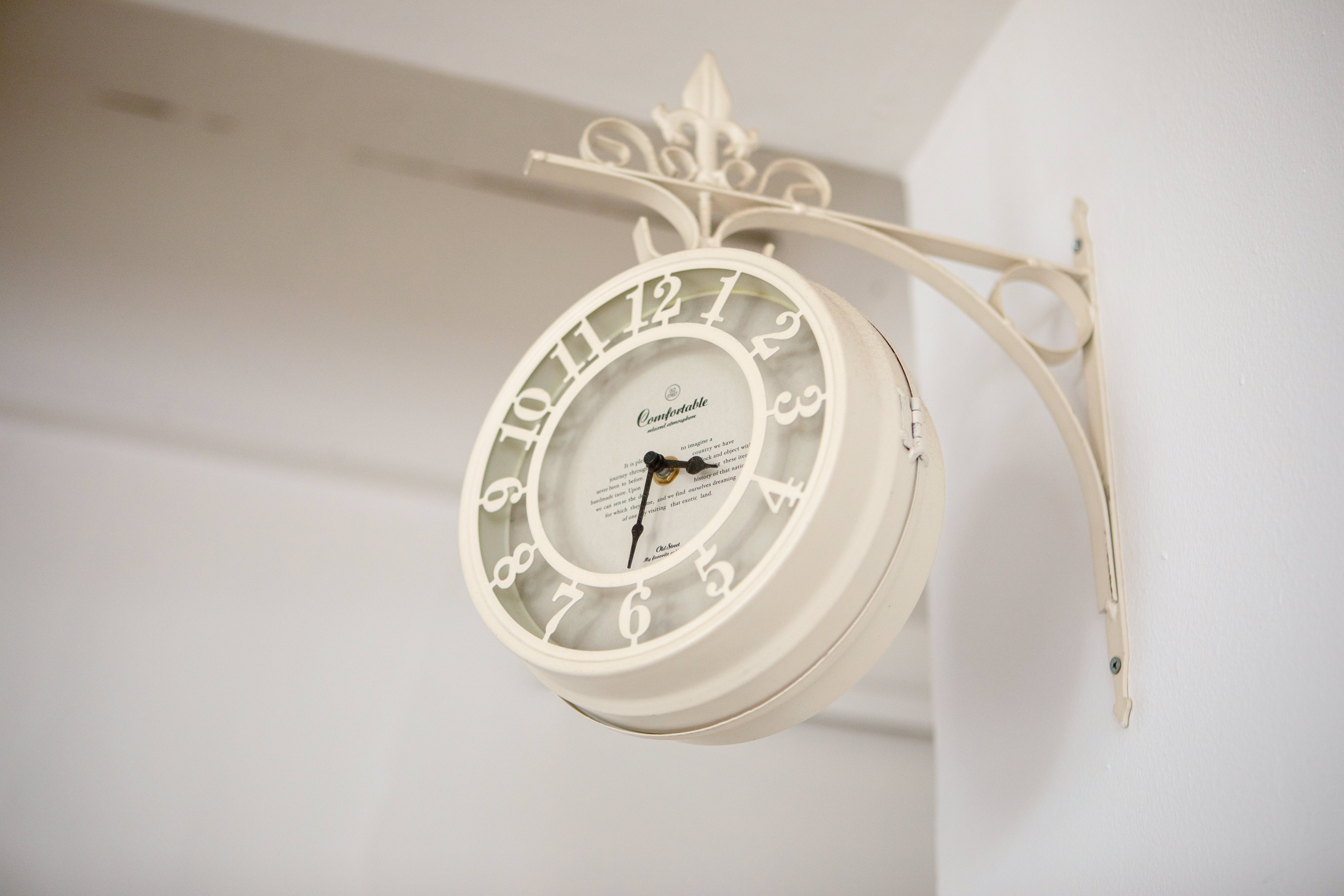 アンティーク調の掛け時計の写真素材です。白い壁に設置された円形の掛け時計で、クラシックなデザインのフェイスに黒い針が付き、正確な時間表示が可能な掛け時計です。インテリアデザインや時間をテーマにしたコンテンツ制作などにおすすめです。