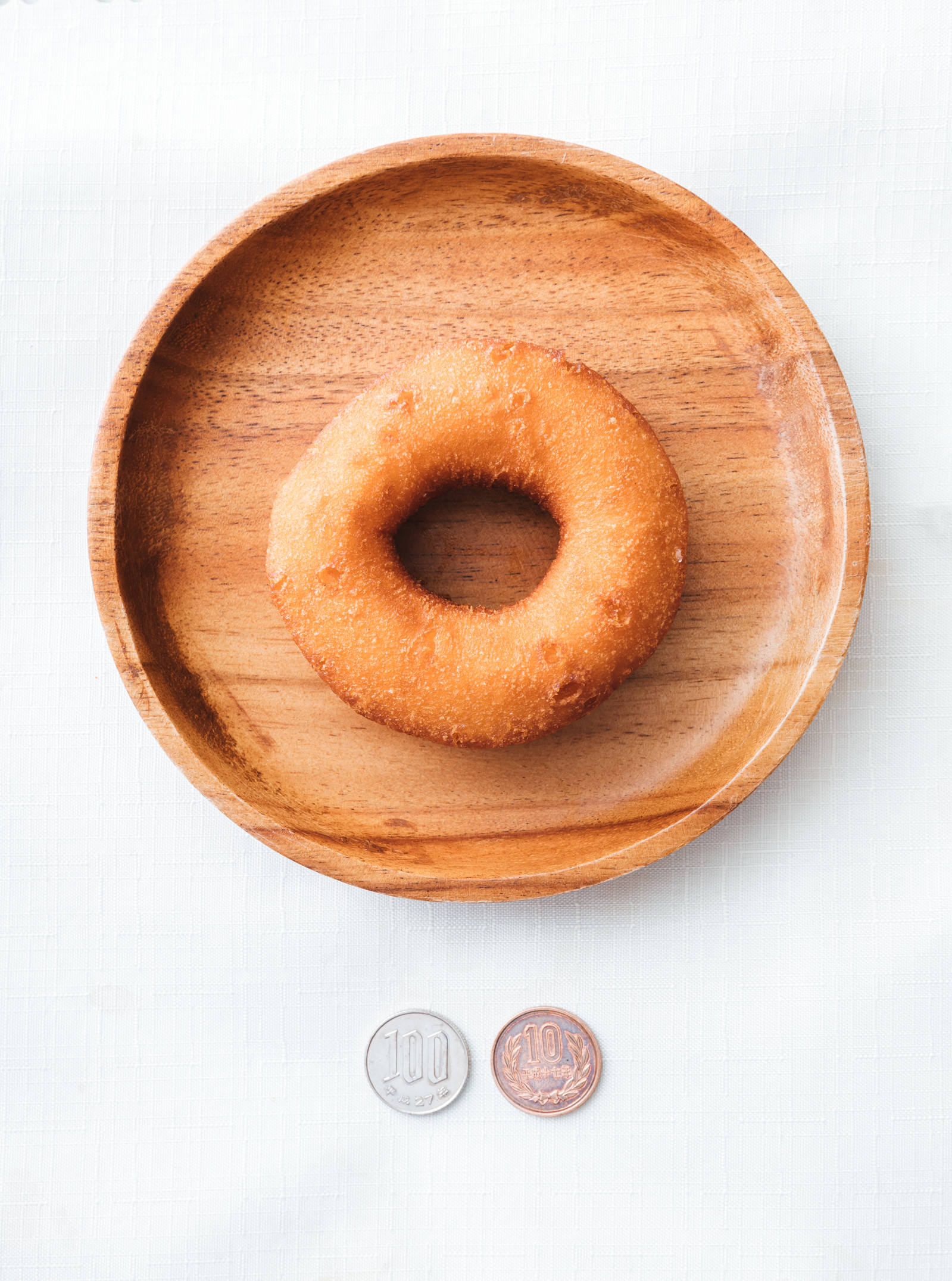 木製のお皿にプレーンドーナッツが一つ盛られた写真素材です。110円という価格設定で、イートイン利用時の消費税や軽減税率の説明資料として活用できます。茶色のシンプルなドーナッツが木製の丸皿に置かれ、カフェメニュー紹介やおやつ関連の資料制作に最適です。