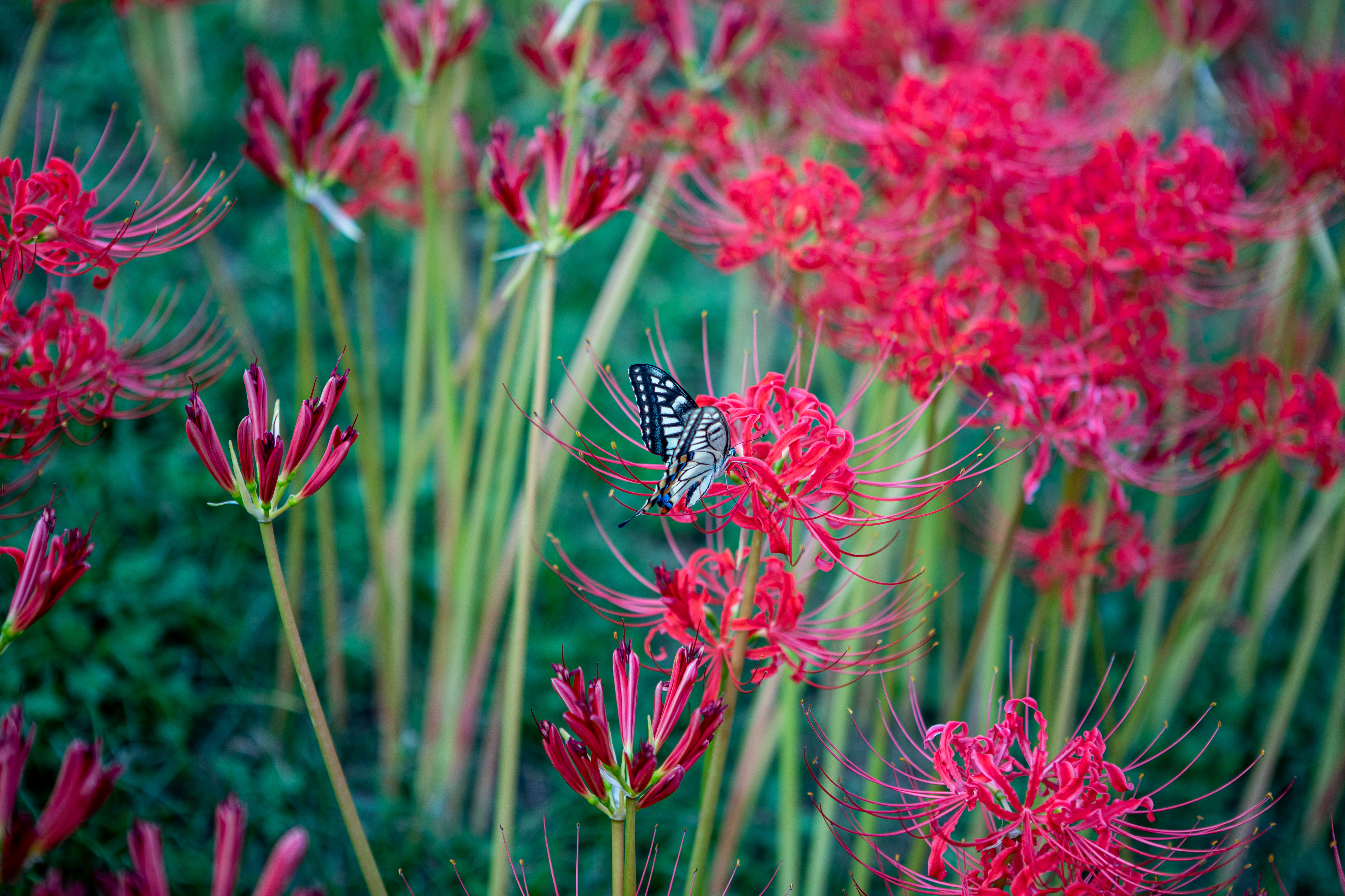 赤い彼岸花の群れに、1頭のアゲハチョウが止まっている写真素材です。花の細い雄しべの上で羽を広げた蝶の姿が写っている。秋の自然や季節感を伝えるコンテンツに使いやすい素材です。