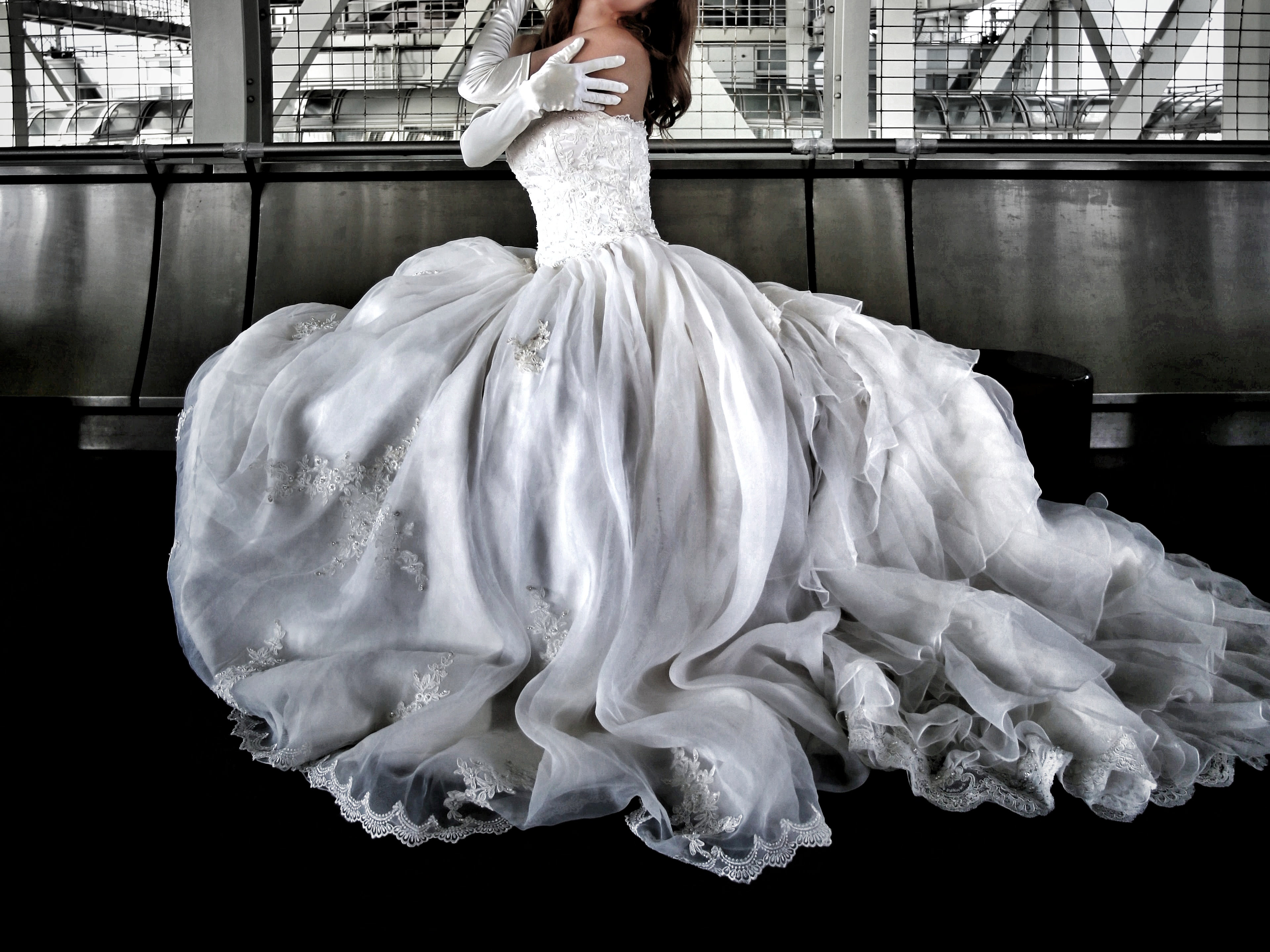 高架下でウェディングドレスを着た女性の写真素材です。メタリックなコンクリートの高架下空間で、白いウェディングドレスを身に纏った女性が座っており、都市的で洗練された雰囲気となっています。ウェディング関連のデザインや、モダンな背景を活かしたブライダルコンテンツ制作などに最適です。