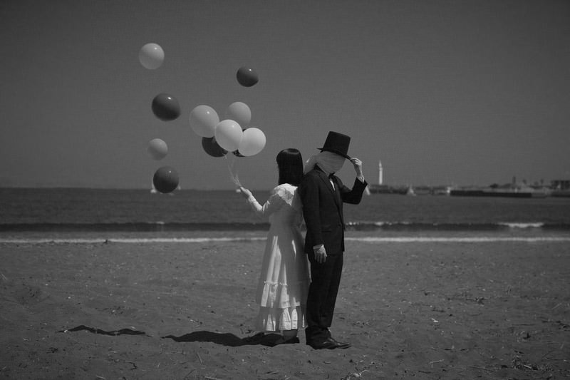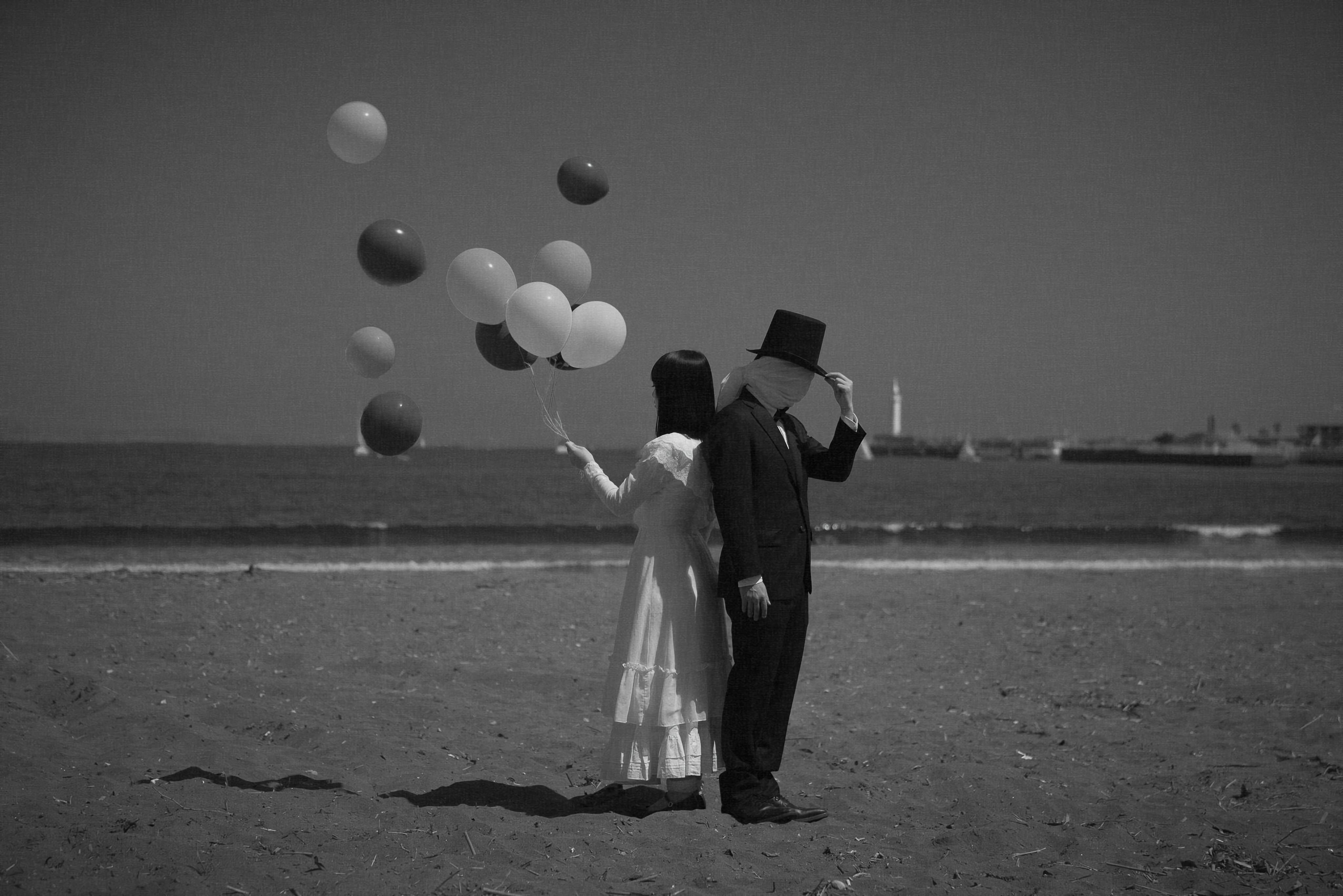 海辺で風船を飛ばすカップルの写真素材です。白いドレスの女性と男性が砂浜に立ち、複数の風船を空に向かって放しており、モノクロで撮影された画面からは二面性や謎めいた雰囲気が読み取れます。恋愛テーマやシュールな表現、心理描写が必要なコンテンツ制作に活用できます。