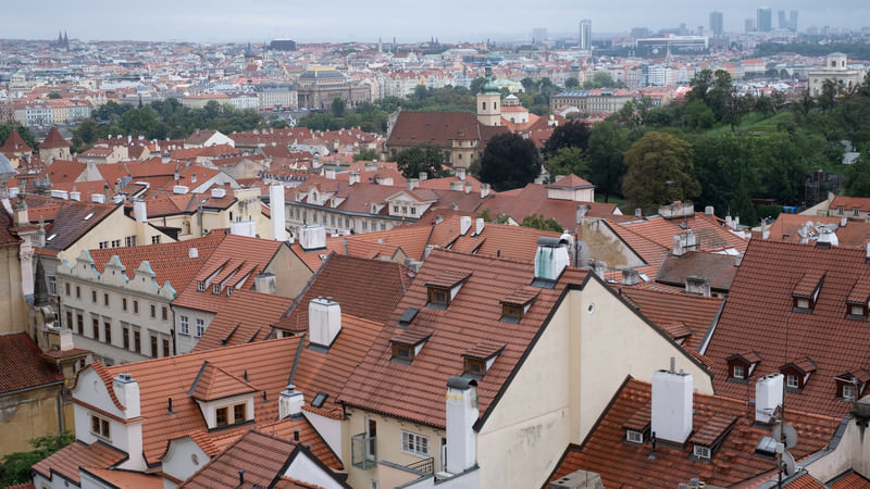 チェコのプラハにある赤茶色の屋根の街並みの写真素材です。統一された瓦屋根と煙突が密集し、中世からの歴史を刻むヨーロッパの古都の風景が広がっています。プラハの象徴的な赤茶色の屋根が織りなす美しい都市景観は、観光地の背景素材や海外の街並みを扱う記事、建築関連のコンテンツなどに最適です。