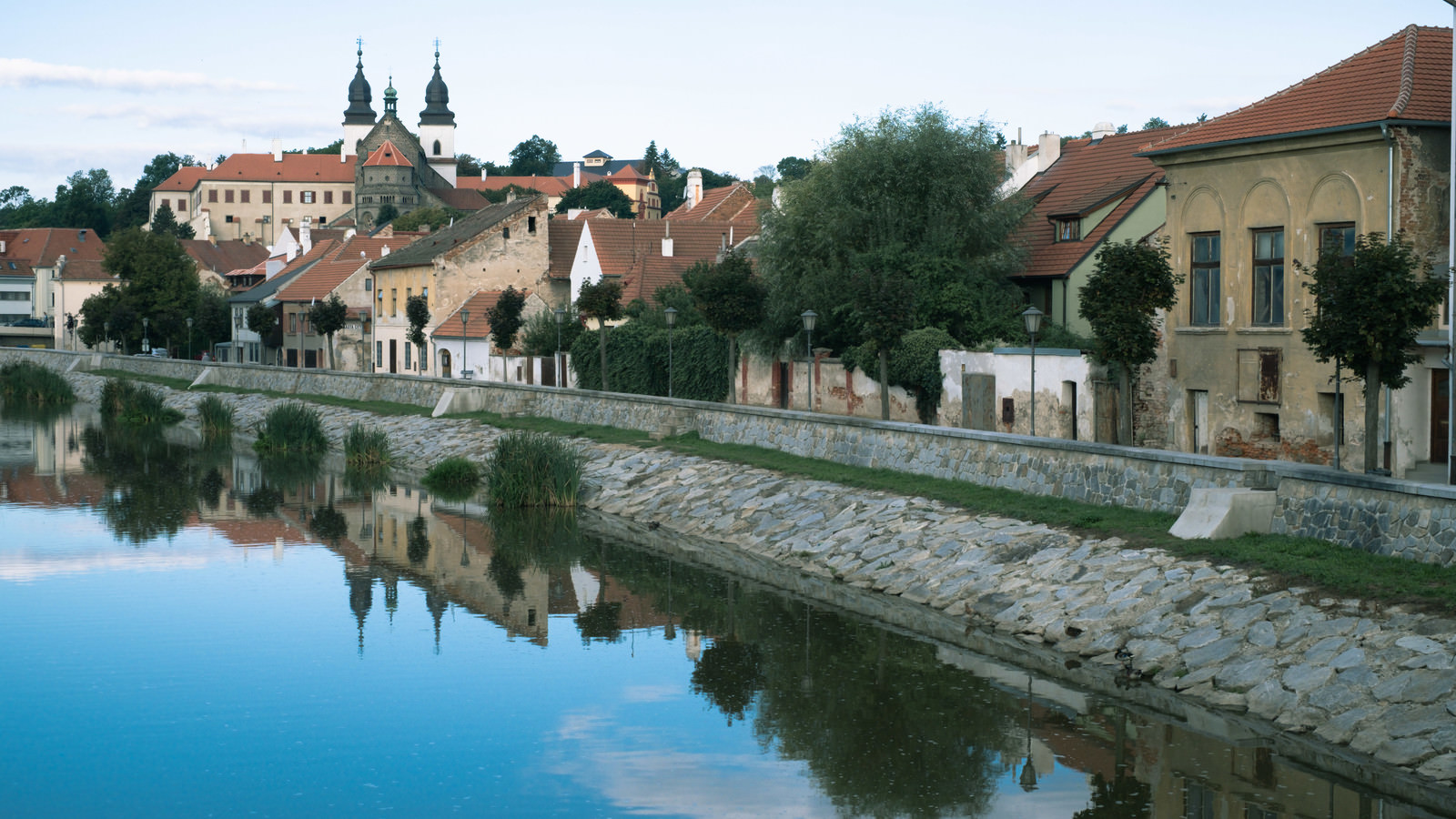 チェコ共和国トルシェビーチ市の町並みの写真素材です。イフラヴァ川の水面に赤いレンガ屋根の建物が鮮明に映り込み、川沿いに立ち並ぶ歴史的な建造物が水面に鏡のように映っています。海外の観光地やチェコの建築、川の風景を用いたウェブサイトやガイドブック、旅行関連の記事制作などにおすすめです。
