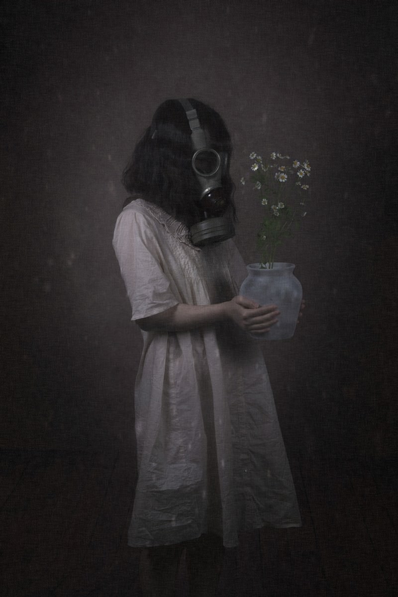 白いワンピースを着た少女の写真素材です。暗い背景の中で花束を持つ少女がモノクロ調で撮影されており、汚染された環境での危機的な状況を表現しています。アート作品やコンセプチュアルなデザイン、社会的メッセージを含むコンテンツ制作などにおすすめです。