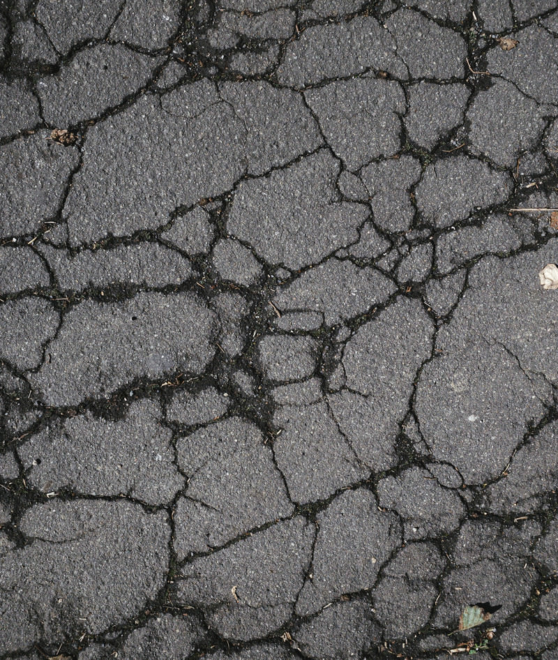 ひび割れたアスファルトの写真素材です。グレーの舗装面に不規則な亀裂が網目状に広がり、経年劣化による表面の損傷を記録しています、コンクリート路面の老朽化表現や、時間経過を視覚化するデザイン素材として活用できます。建設関連の資料やテクスチャー素材、劣化をテーマにしたデザイン制作などにおすすめです。