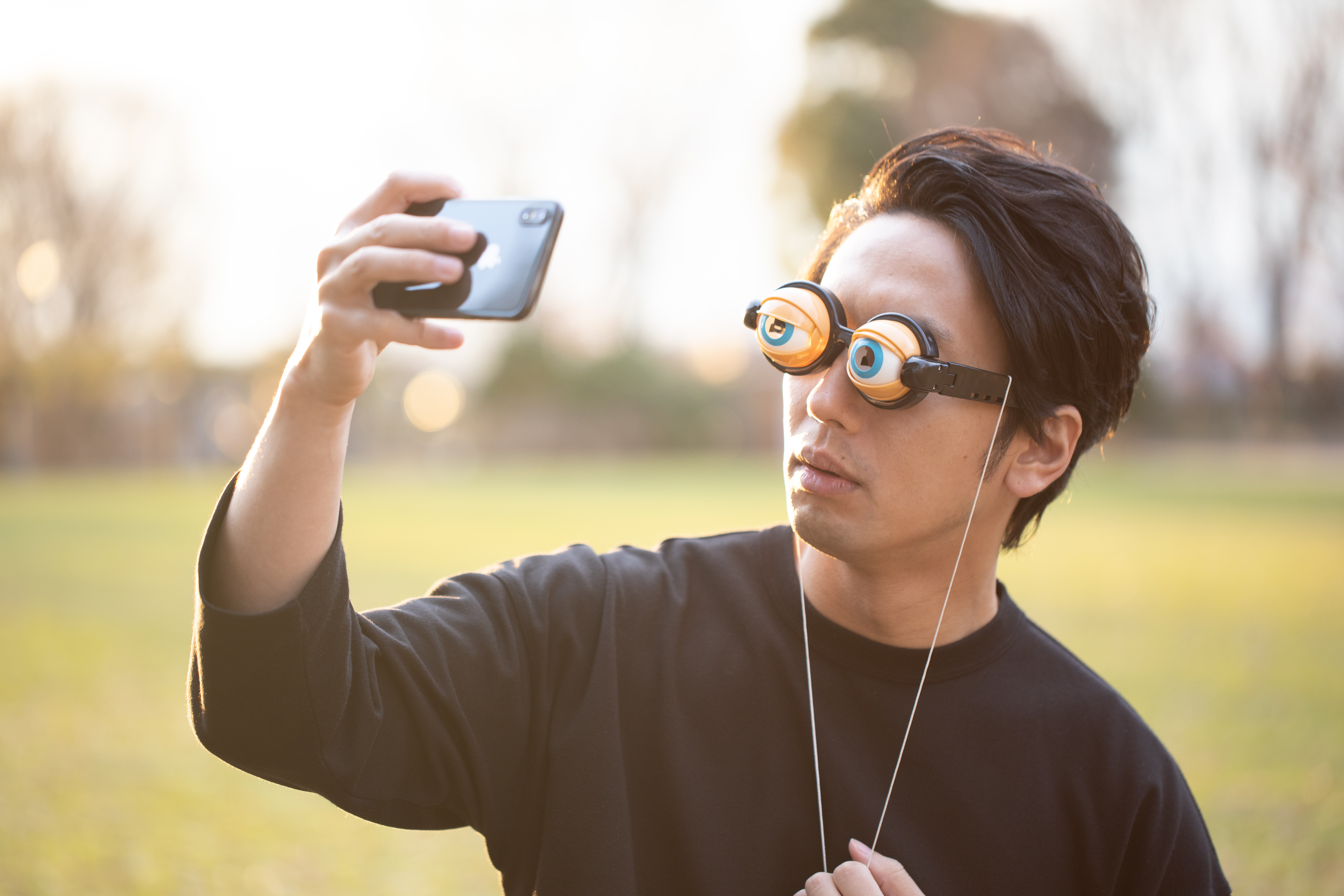 誇張しすぎたセルフィーの写真素材です。男性が目玉のような小道具を顔に当てながら狂気的に自撮りをしており、滑稽でユニークなパロディ表現となっています。SNSコンテンツやコミカルな広告素材、ユーモア系の記事制作などに活用できます。
