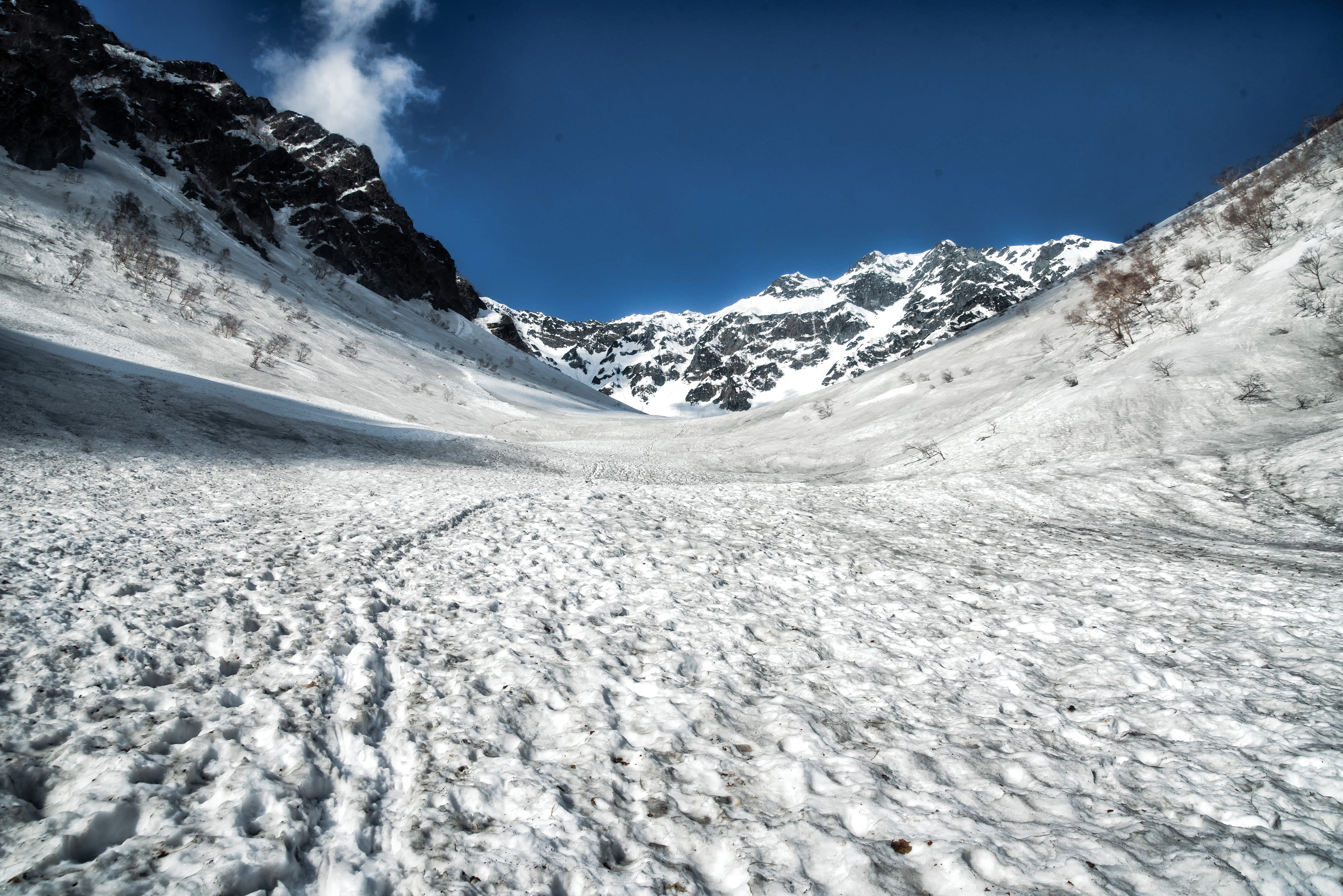 涸沢へ続く残雪のトレースの写真素材です。雪に覆われた山間部に登山者の足跡が幾筋も続き、青空と雪化粧した山々が背景に広がっています。冬の高山の登山活動を記録した素材で、登山ブログやトレッキングガイド、冬山の記事制作などにおすすめです。