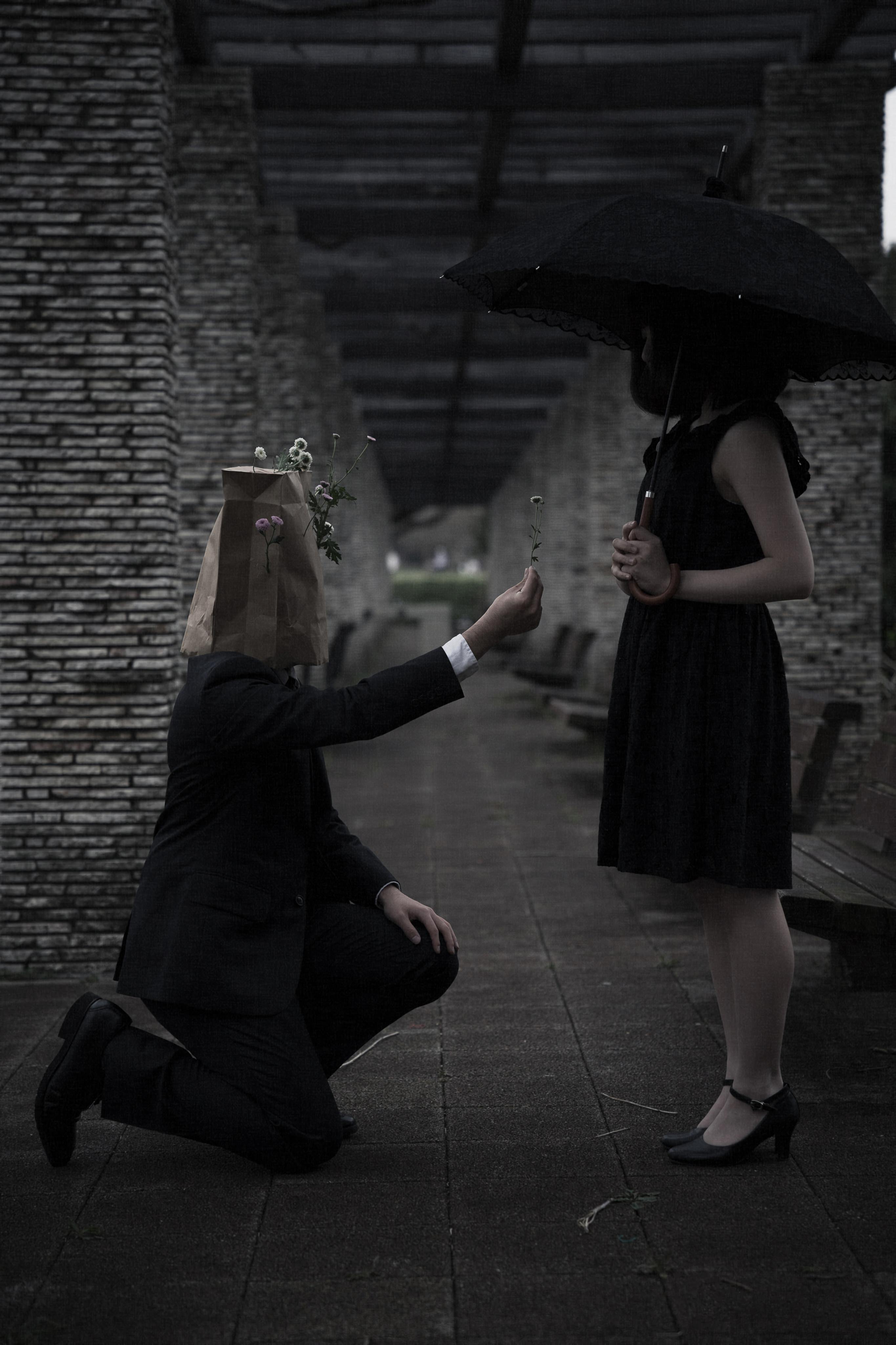 紙袋を被った男性が女性にお花を手渡している写真素材です。暗い室内で膝をついた男性が自ら摘んだ花束を差し出し、立っている女性に失恋を告白する切実なシーンを表現しています。恋愛ドラマのワンシーンやストーリー性のあるコンテンツに活用できます。