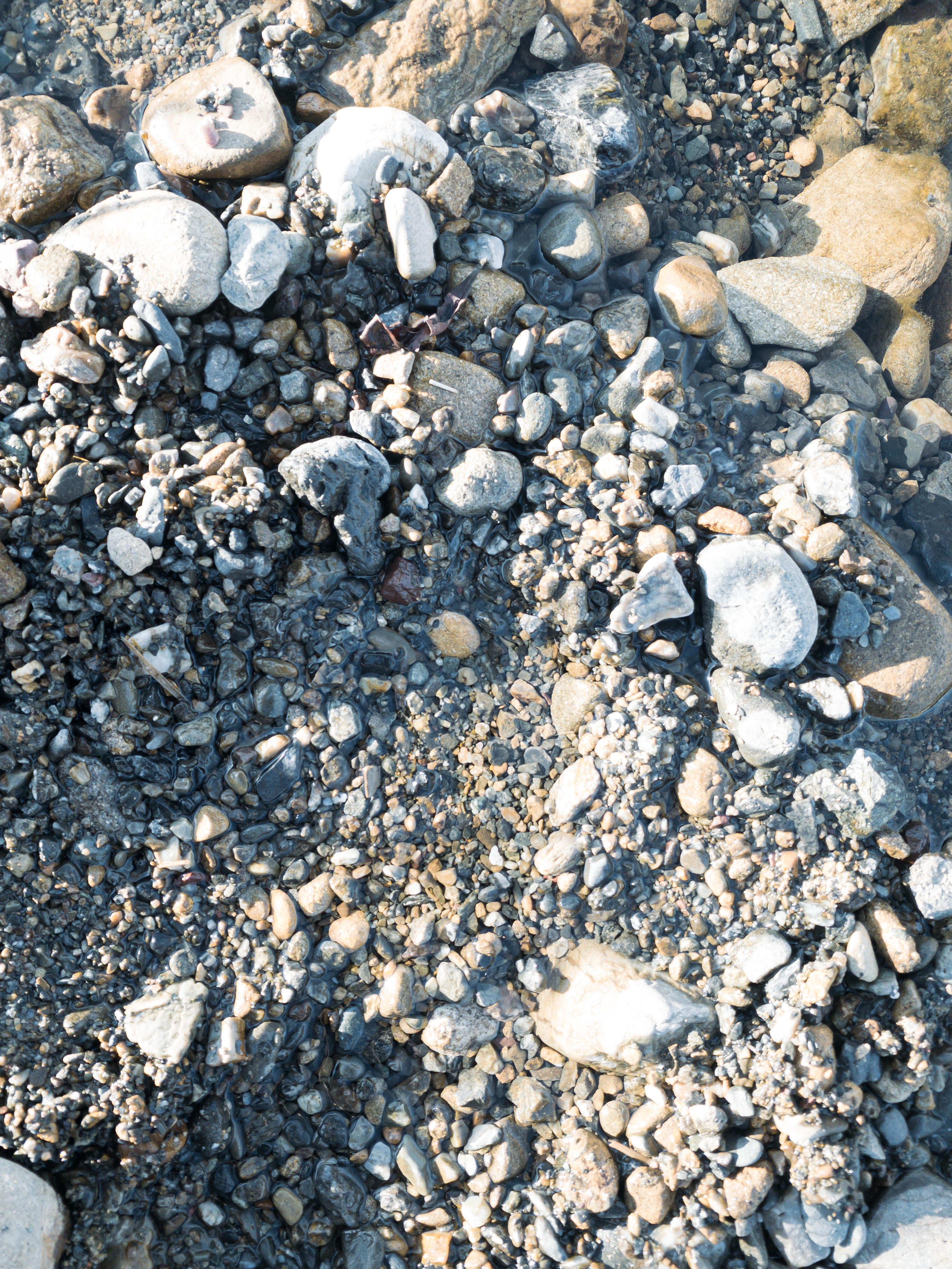 砂利と石が散らばる地面の写真素材です。大小の石や砂利が不規則に配置され、退かされた石の跡に凹みが見られ、土や砂利が堆積した地肌の風合いを表現しています。自然な地表の質感を備えており、背景デザインやテクスチャー素材として活用できます。