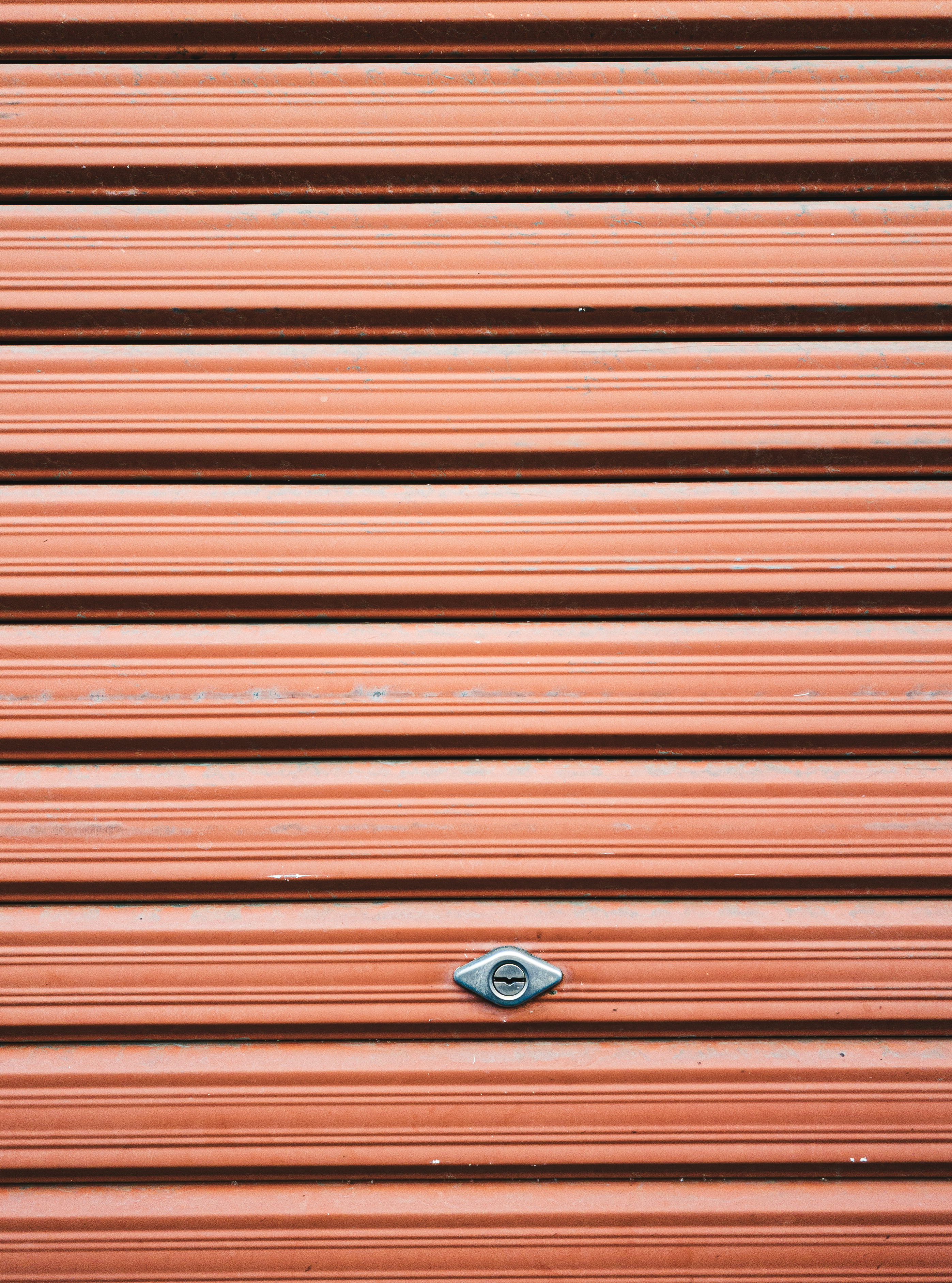赤茶色のシャッターの写真素材です。金属製のシャッターが水平に並んだ横縞模様を形成し、下部には小さな取っ手が付いた規則正しく繰り返されるテクスチャーとなっています。建築関連の資料やテクスチャー素材、背景画像などにおすすめです。
