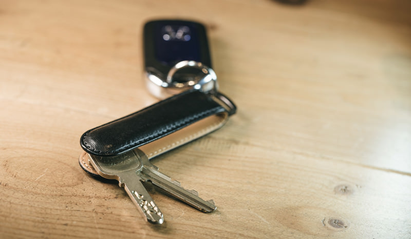 木製テーブル上のキーケースと鍵の写真素材です。黒いレザー製のキーケースから複数の鍵が出ており、ロック機能付きで安全性に優れています。ナチュラルな木目のテーブル面に置かれた状態を撮影しており、バッグの中身紹介やライフスタイル、日用品関連のコンテンツ制作におすすめです。