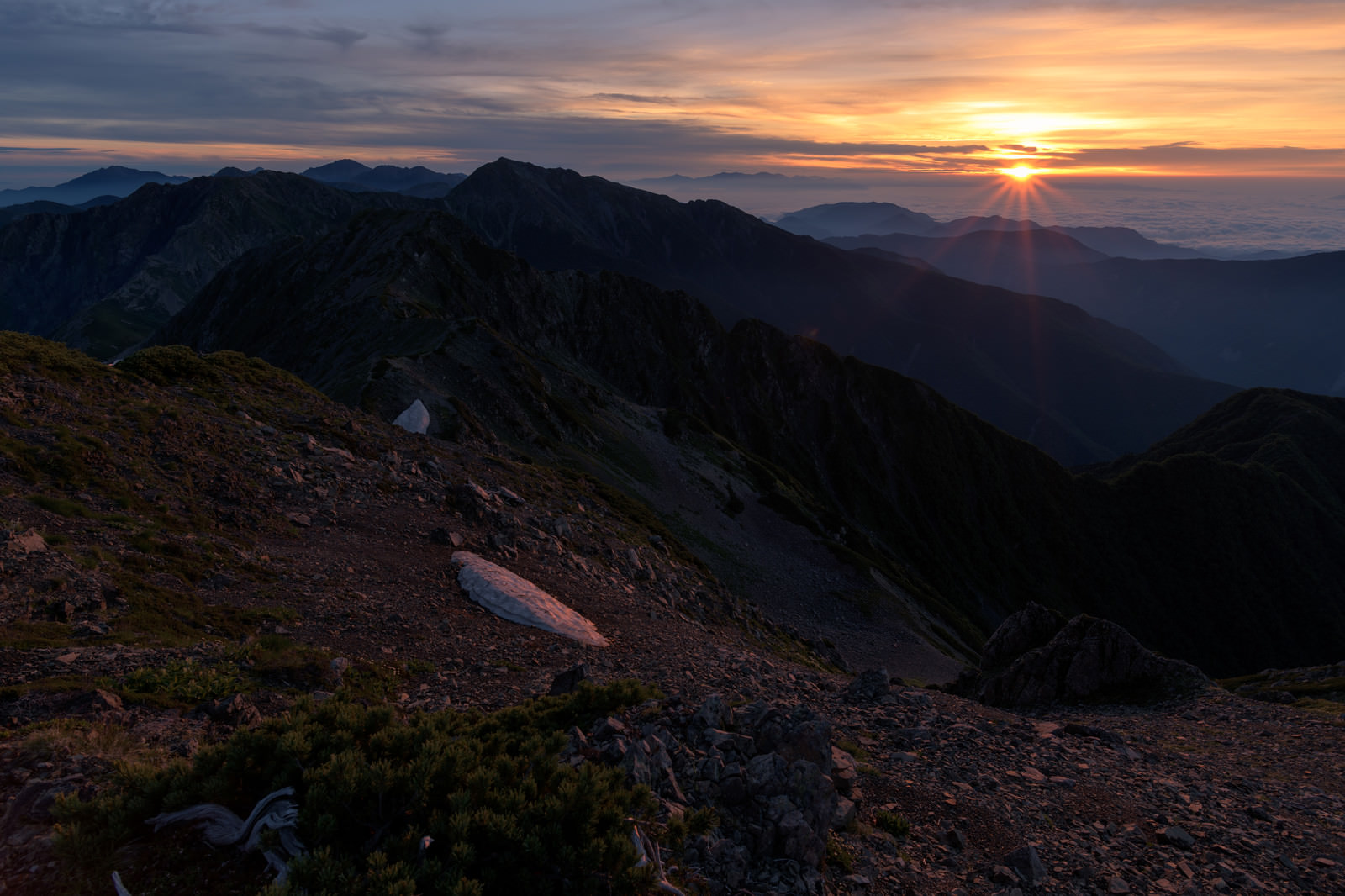 赤石岳山頂から見る朝焼けと南アルプスの山々の写真素材です。南アルプスの100名山である赤石岳の山頂から、オレンジ色に染まった空と雲海に浮かぶ山稜線、早朝の澄んだ空気の中で朝日が山々を照らす情景をご覧いただけます。登山ブログや山岳写真の展示、アウトドア関連のWebサイト制作などにおすすめです。