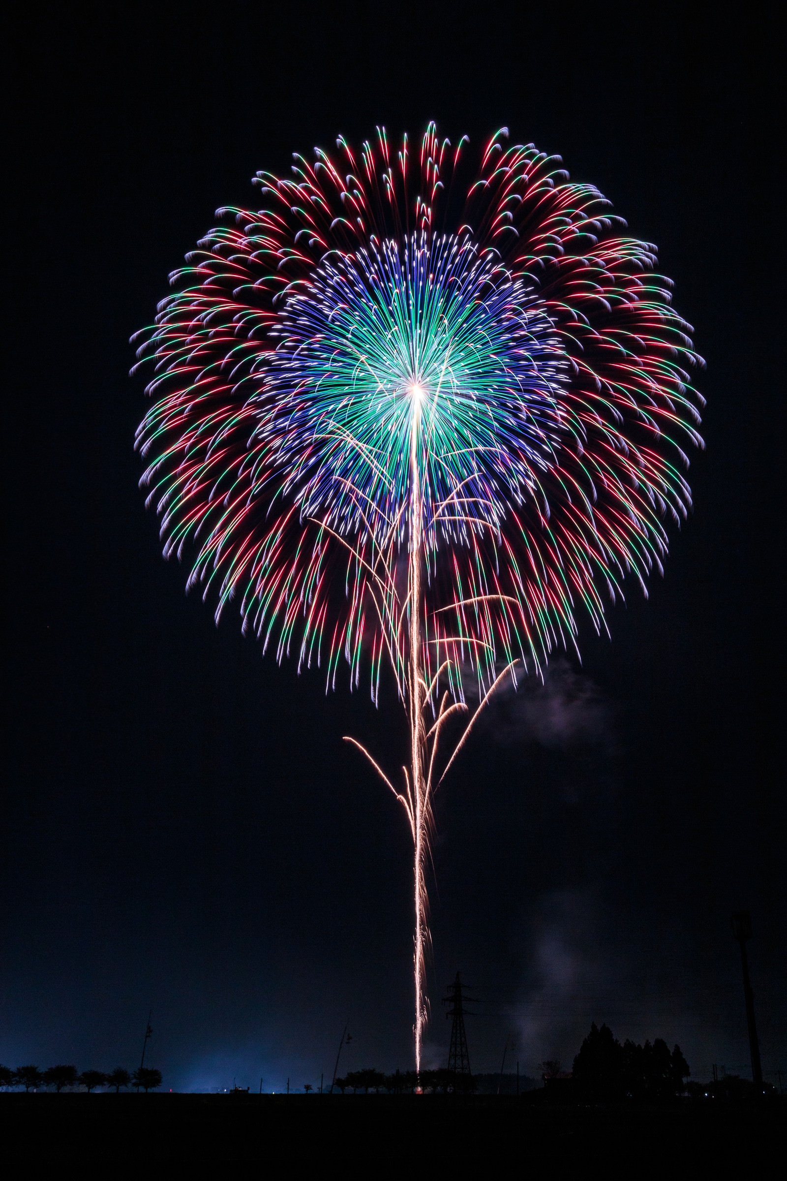 大曲の花火(春の章)で打ち上げられた花火の写真素材です。夜空に中心から放射状に広がる光の筋が赤・緑・青など複数の色で広がり、下部には建物や電柱のシルエットが見える。花火大会の告知や夏のイベント関連コンテンツにおすすめです。