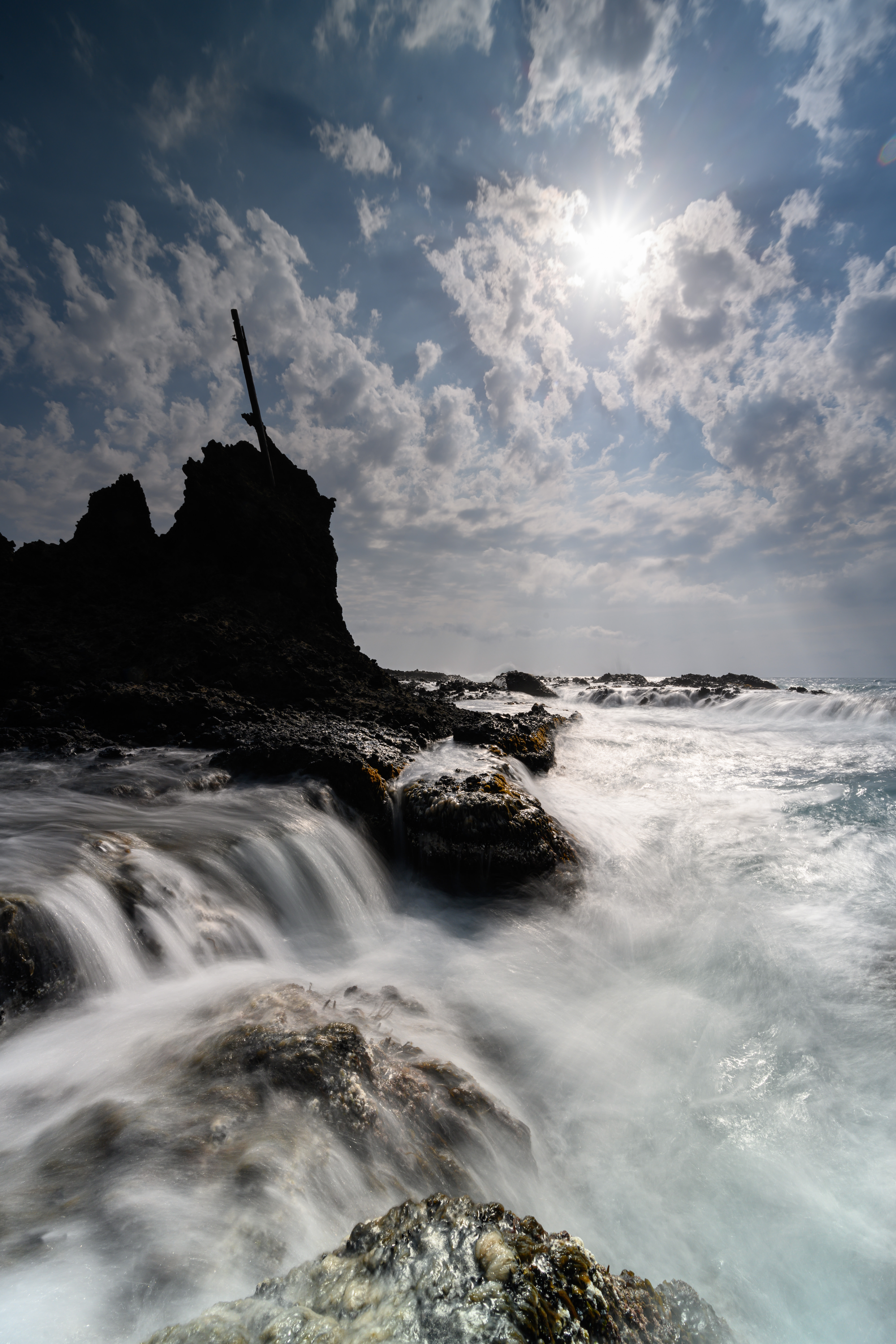 波打ち際と岩礁の写真素材です。黒いシルエットの岩礁が海に突き出し、白い波しぶきが岩肌に打ち寄せ、北海道積丹町の雄大な海岸の魅力を表現しています。ダイナミックな波と岩肌の対比が特徴的で、海岸の風景素材や北海道観光関連のコンテンツ制作に最適です。