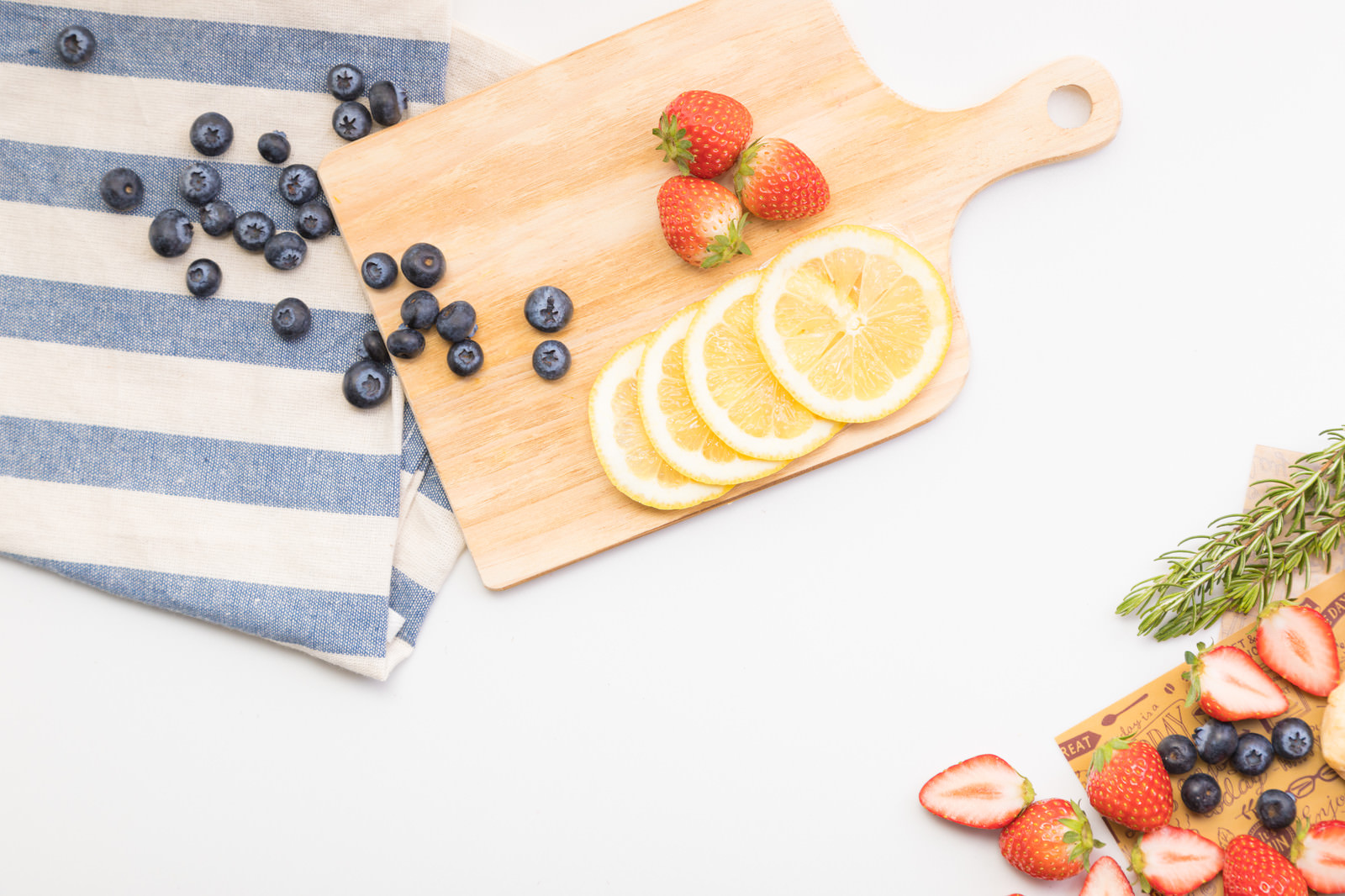 木製カッティングボードに並んだカットフルーツの写真素材です。輪切りのレモン、新鮮なイチゴ、ブルーベリーがバランスよく配置され、そのまま食卓に出せます。料理ブログやレシピサイト、健康・栄養関連のWebサイトにおすすめです。