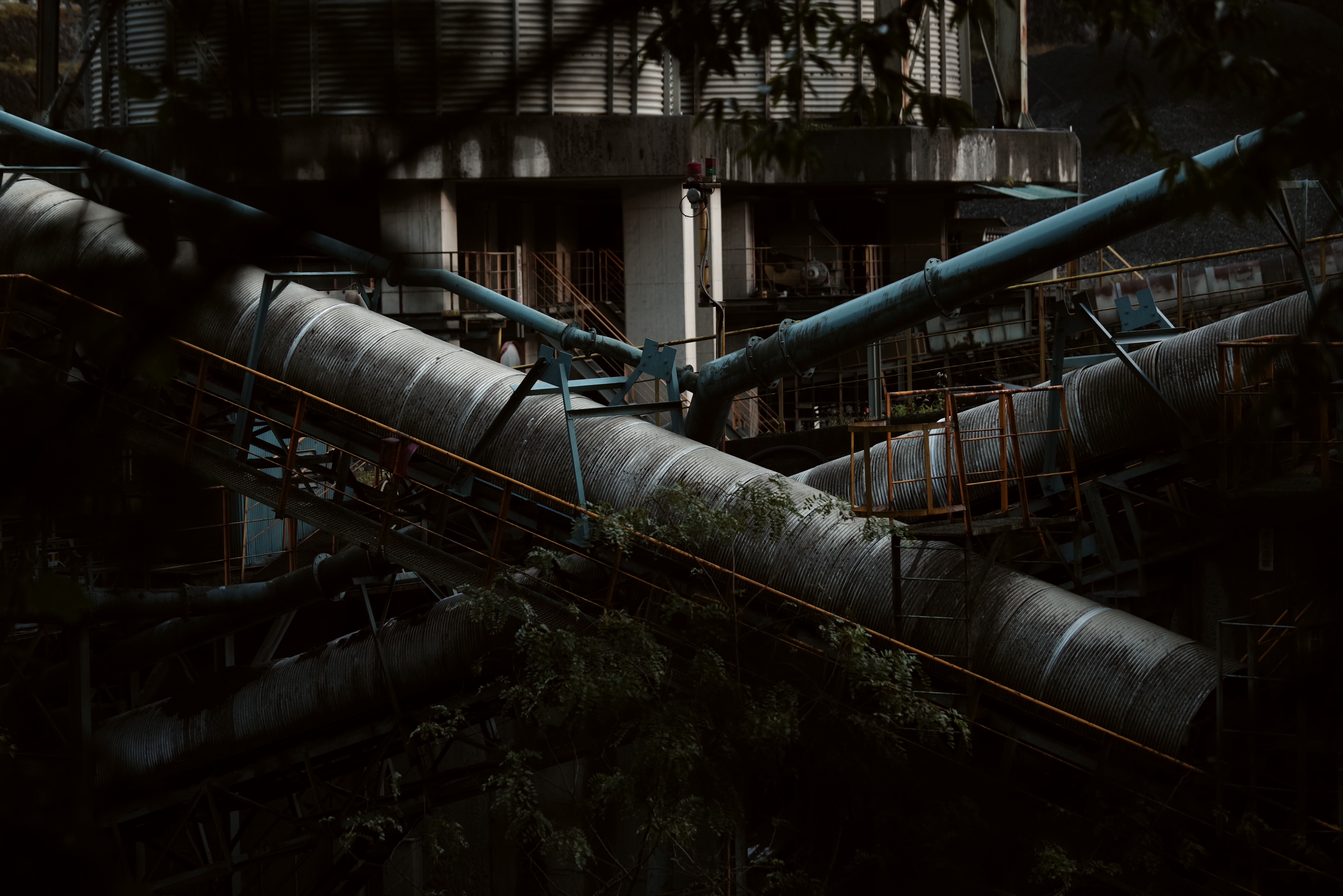 山の奥地にある採石場の設備の写真素材です。薄暗い環境に古びた機械設備や配管が複雑に交差する重厚感のある工業空間で、年月の経過が刻まれた詳細なディテールが随所に見られます。工場萌えや廃墟、工業遺産関連のコンテンツ制作に最適です。