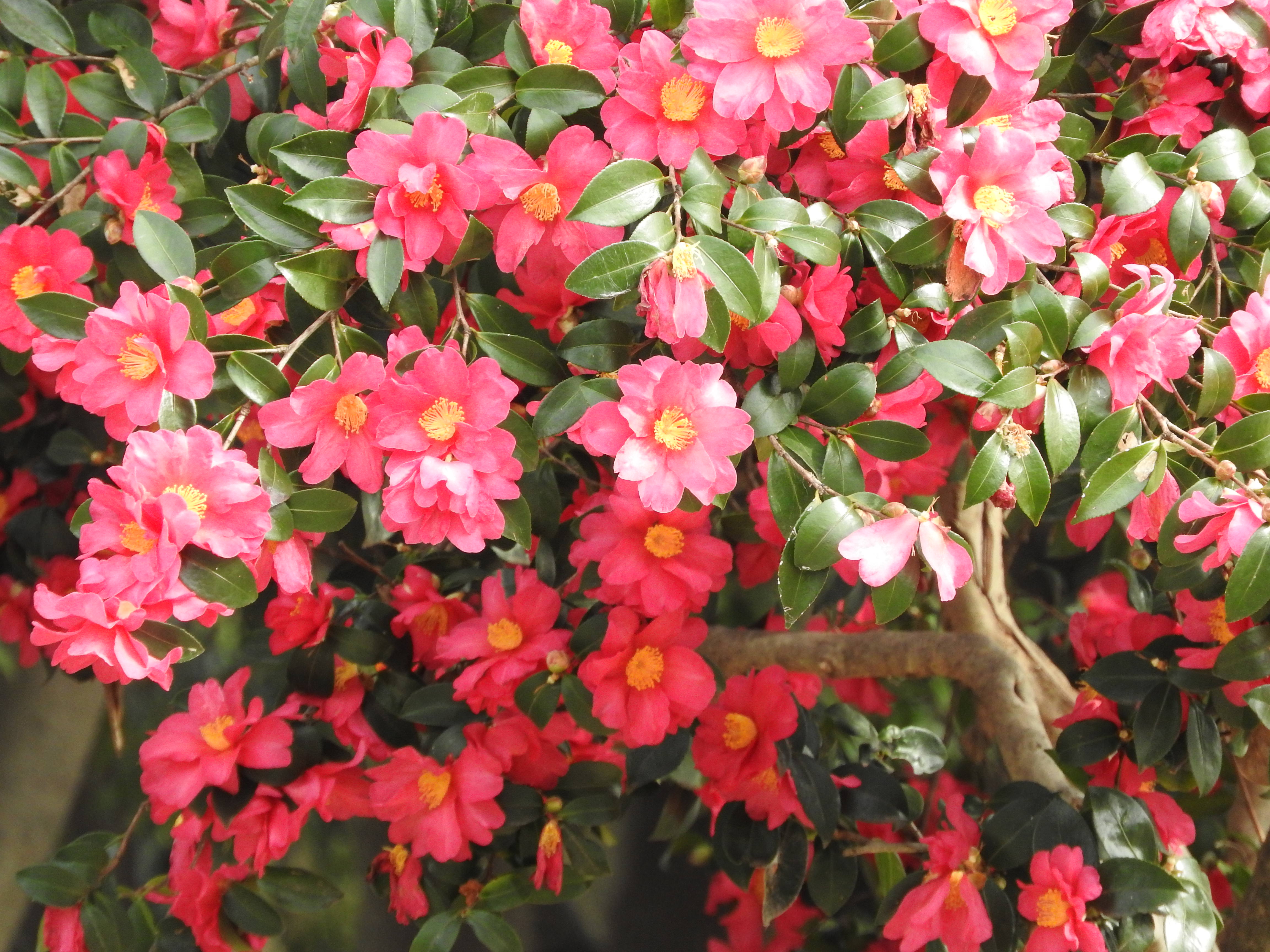 Camellia sasanqua flowers in pink blooming on branches
