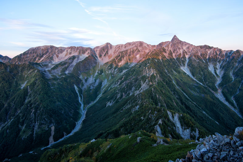 モルゲンロートを迎える槍ヶ岳の写真素材です。夜明け時に薄いピンク色に染まった稜線が連なり、手前には緑の山肌が広がっています。北アルプスの雄大な山岳風景を収めた朝焼けの情景で、山岳写真素材として活用できます。