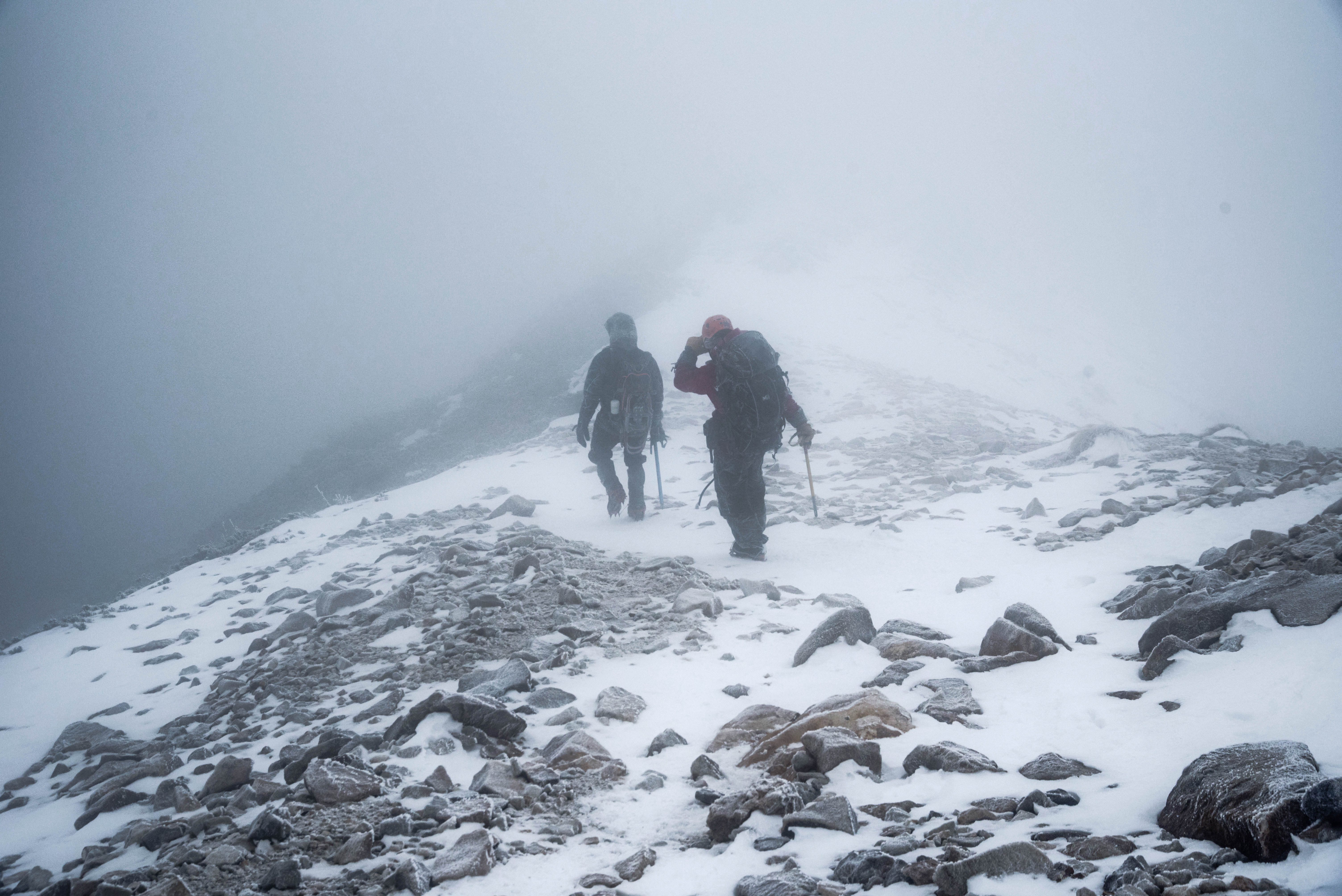 ホワイトアウト状態の雪山を下山する登山者の写真素材です。真っ白に視界が遮られた中、防寒着を着た登山者たちが足元を確認しながら、ロープで確保された状態で慎重に下山しています。登山の危険性や冬山の過酷な環境を表現する必要がある場面などにおすすめです。
