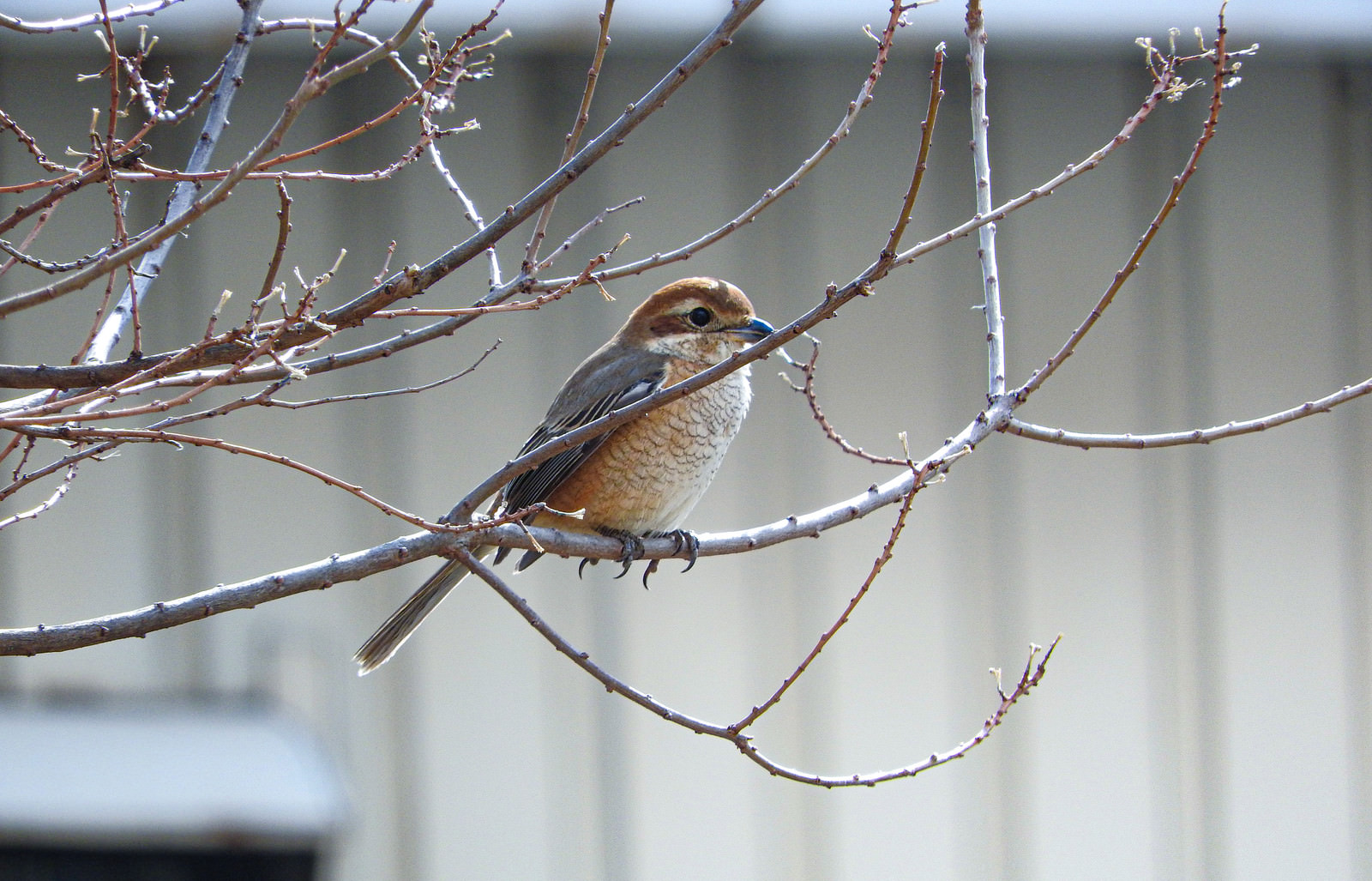 枝に止まるジョウビタキの写真素材です。オレンジ色の羽毛を持つ小鳥が細い枝にとまり、冬場に日本に飛来する野鳥で、背景はぼけた暗い色合いです。スズメより小さい野生動物で、野鳥観察やバードウォッチング、自然関連のコンテンツ制作におすすめです。