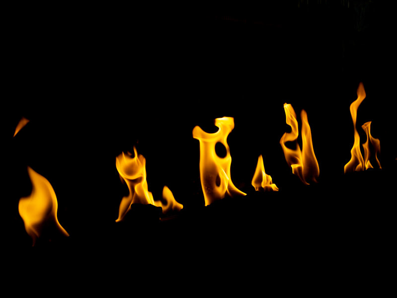 黒い背景に燃え上がる炎の写真素材です。複数の炎がメラメラと激しく輝きながら左から右へと並び、オレンジ色や黄色に踊るように立ち上がっています。火をテーマにしたデザインや情熱的な表現を必要とするコンテンツ制作、バナー製作などにおすすめです。