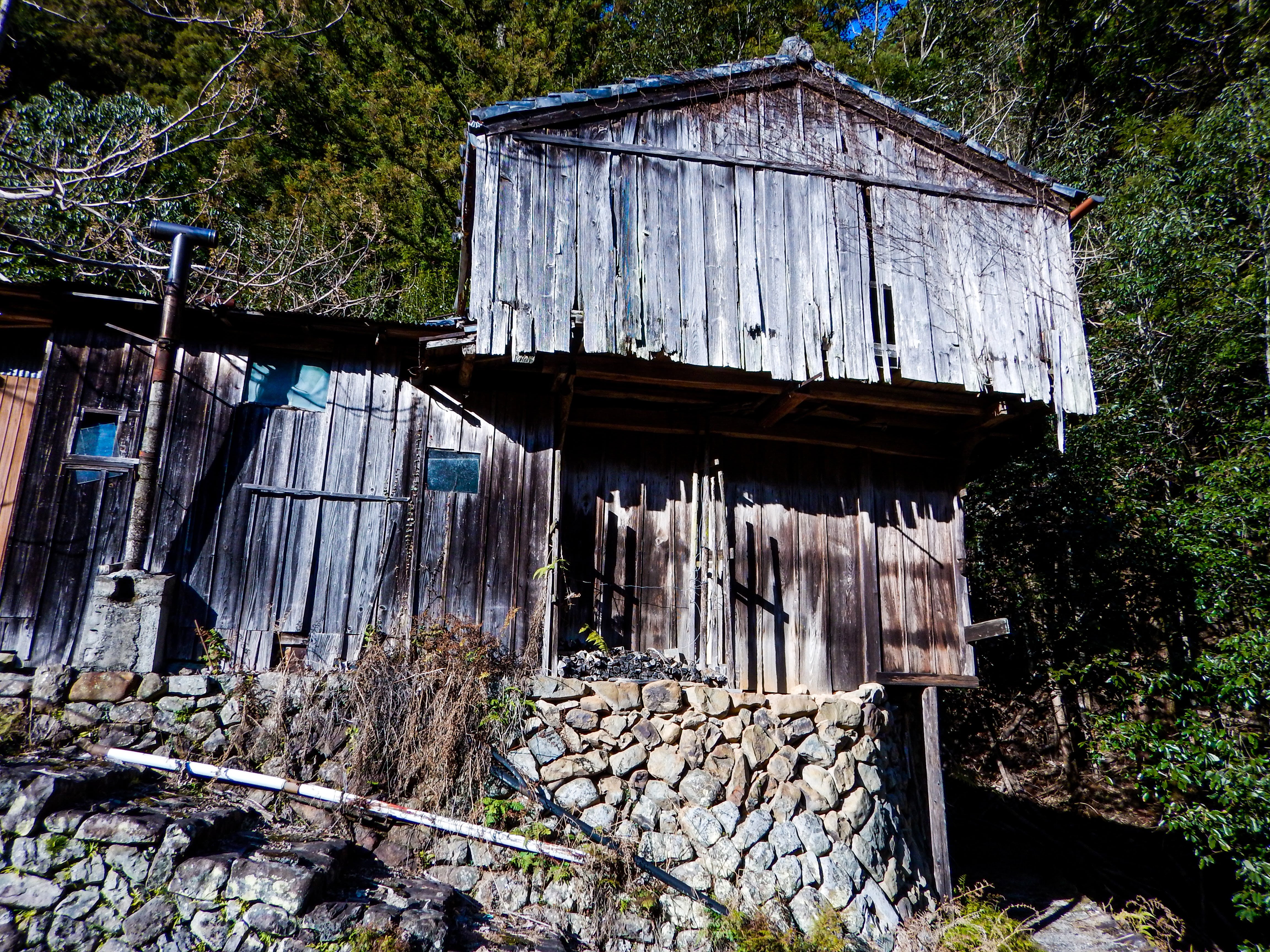 倒壊寸前の廃屋の写真素材です。森の中の石垣の上に建つ木造建築で、トタン屋根や壁が朽ち果て、ボロボロに劣化した半壊状態。廃墟表現や時の経過を表現したい場面、歴史や衰退をテーマとした作品制作などにおすすめです。