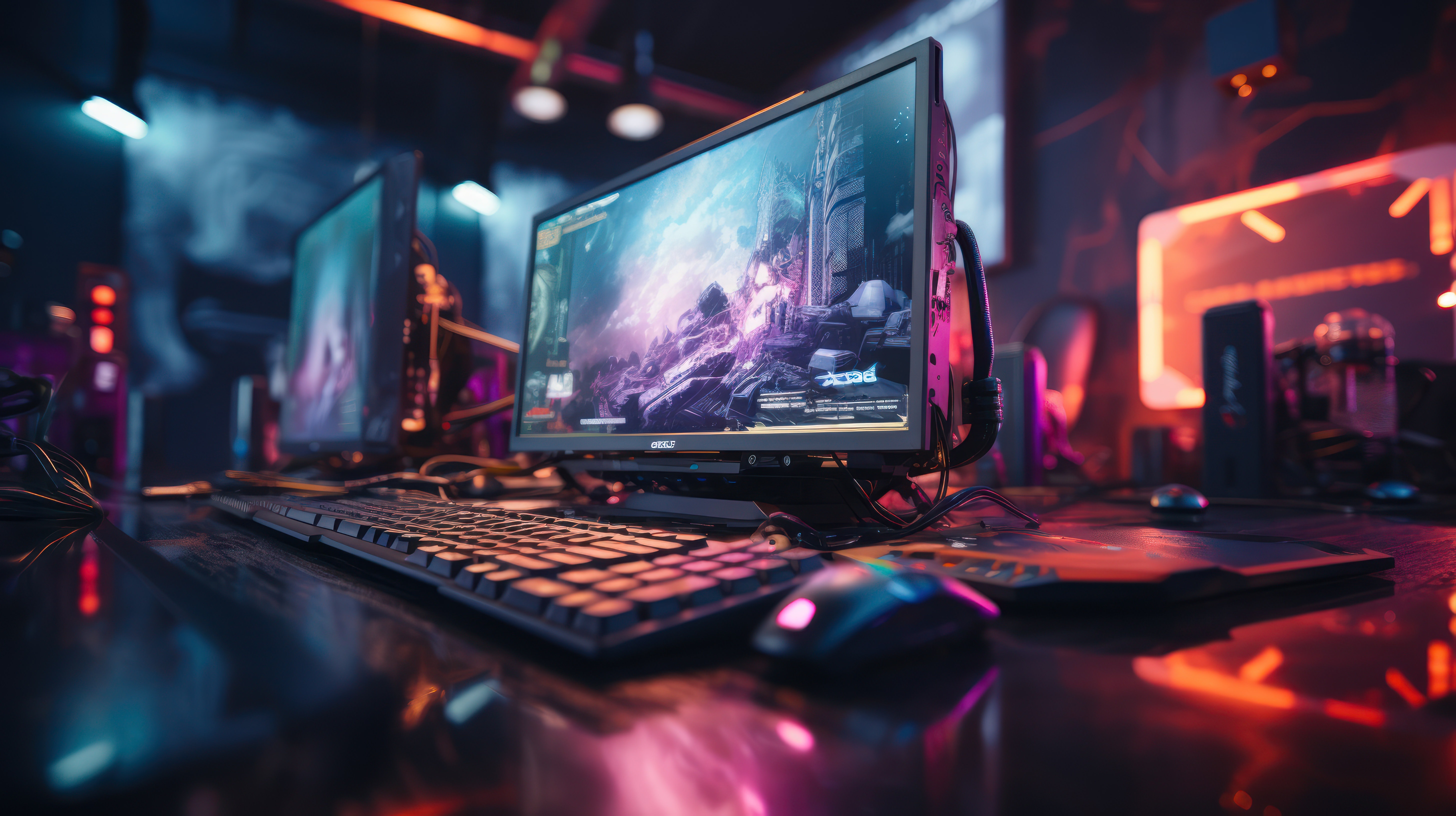 LED照明が映えるゲーミングPCとデスクトップのセットアップのAI画像素材(フリー)