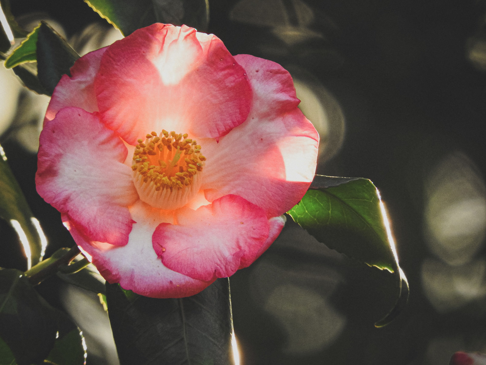 ピンクと白のグラデーションが入った八重咲きの椿の写真素材です。花を正面から撮影したもので、葉がぼけた暗い背景の中に一輪が浮かぶ。春の季節素材や和風デザイン、ガーデニング関連のコンテンツ制作にご利用いただけます。