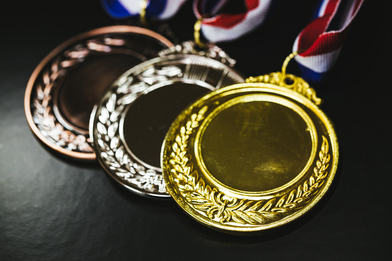 金・銀・銅の3つのメダルの写真素材です。リボン付きで金メダルが手前、銀メダルと銅メダルが後方に配置され、順位と競争の成果を視覚的に表現しています。スポーツ大会や競技会の表彰式、成果発表などで受賞者の栄誉を演出するのにおすすめです。