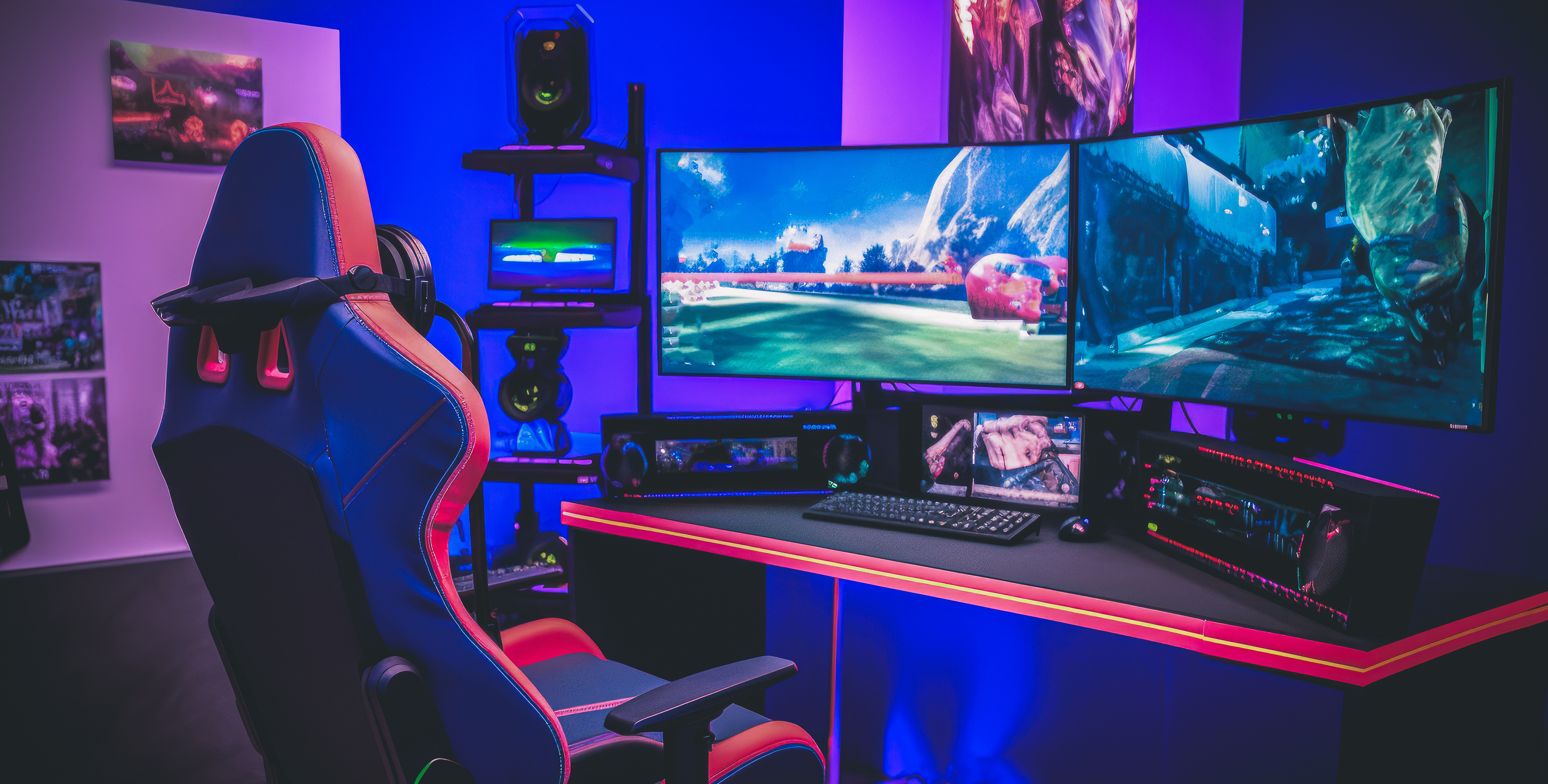 AIで生成したゲーミングデスク環境の画像素材です。紫とブルーのネオンライトに照らされたゲーミングチェア、複数のモニター、キーボードなどが配置され、競技的なゲーム空間を表現しています。ゲーム業界やeスポーツ関連の記事、ゲーム配信の告知などに活用できます。