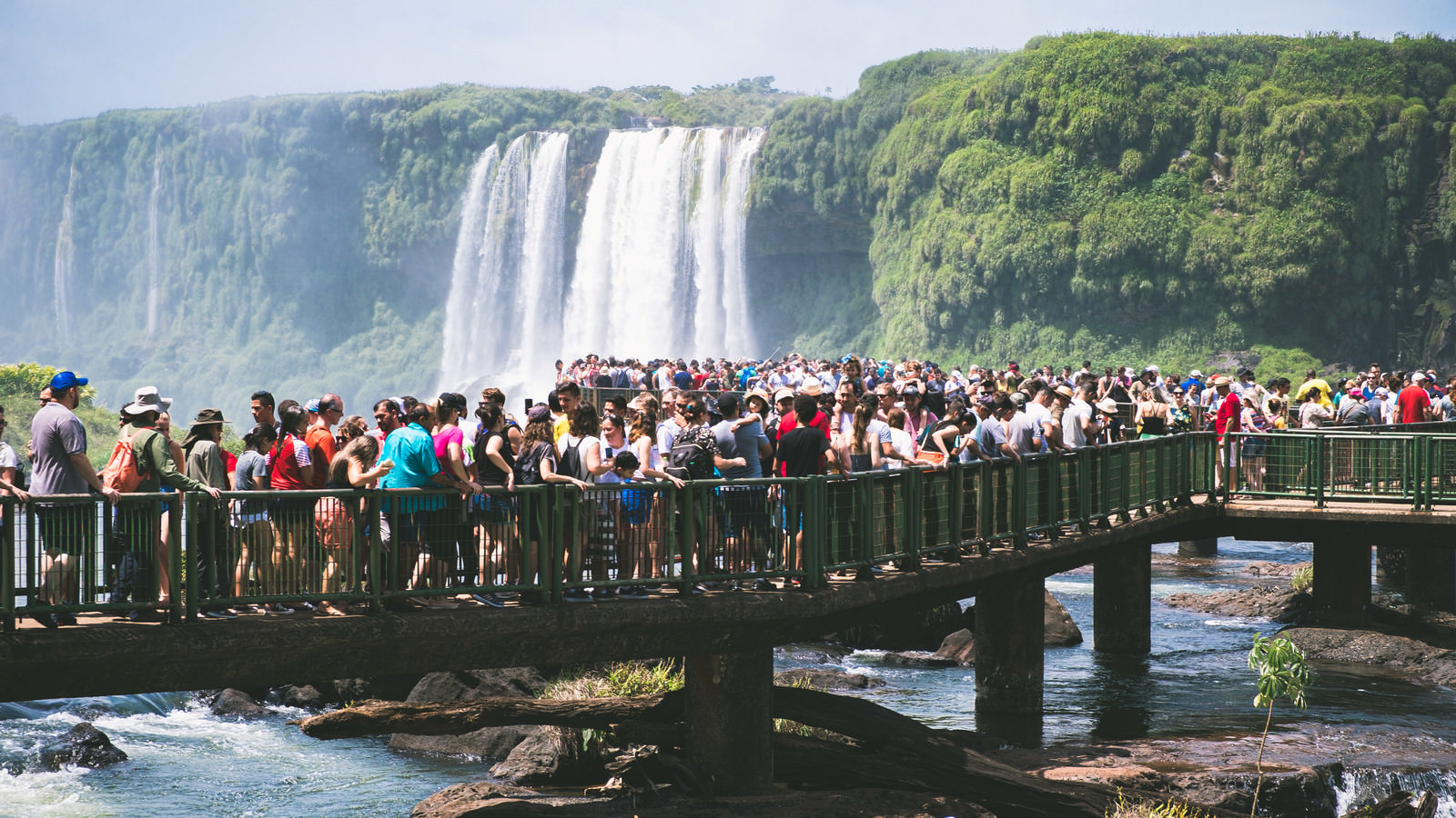 イグアスの滝の展望台に集まる観光客の写真素材です。アルゼンチンとブラジルの国境に位置する世界遺産の壮大な滝を見学するため、遊歩道や展望台に大勢の観光客が行列をつくり、最前線からの眺めを待っています。旅行記事や観光ガイド、世界遺産関連のコンテンツに最適です。