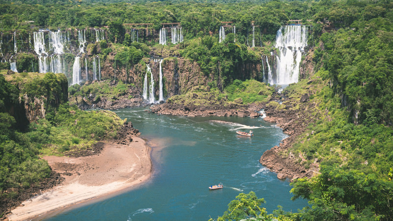 森に囲まれたイグアスの滝と川の写真素材です。アルゼンチンとブラジルの境界にある世界遺産イグアスの滝は、多数の滝群がエメラルドグリーンのイグアス川に流れ落ちる雄大な景観を誇ります。観光地素材や自然風景、旅行・地理関連のコンテンツ制作に最適です。