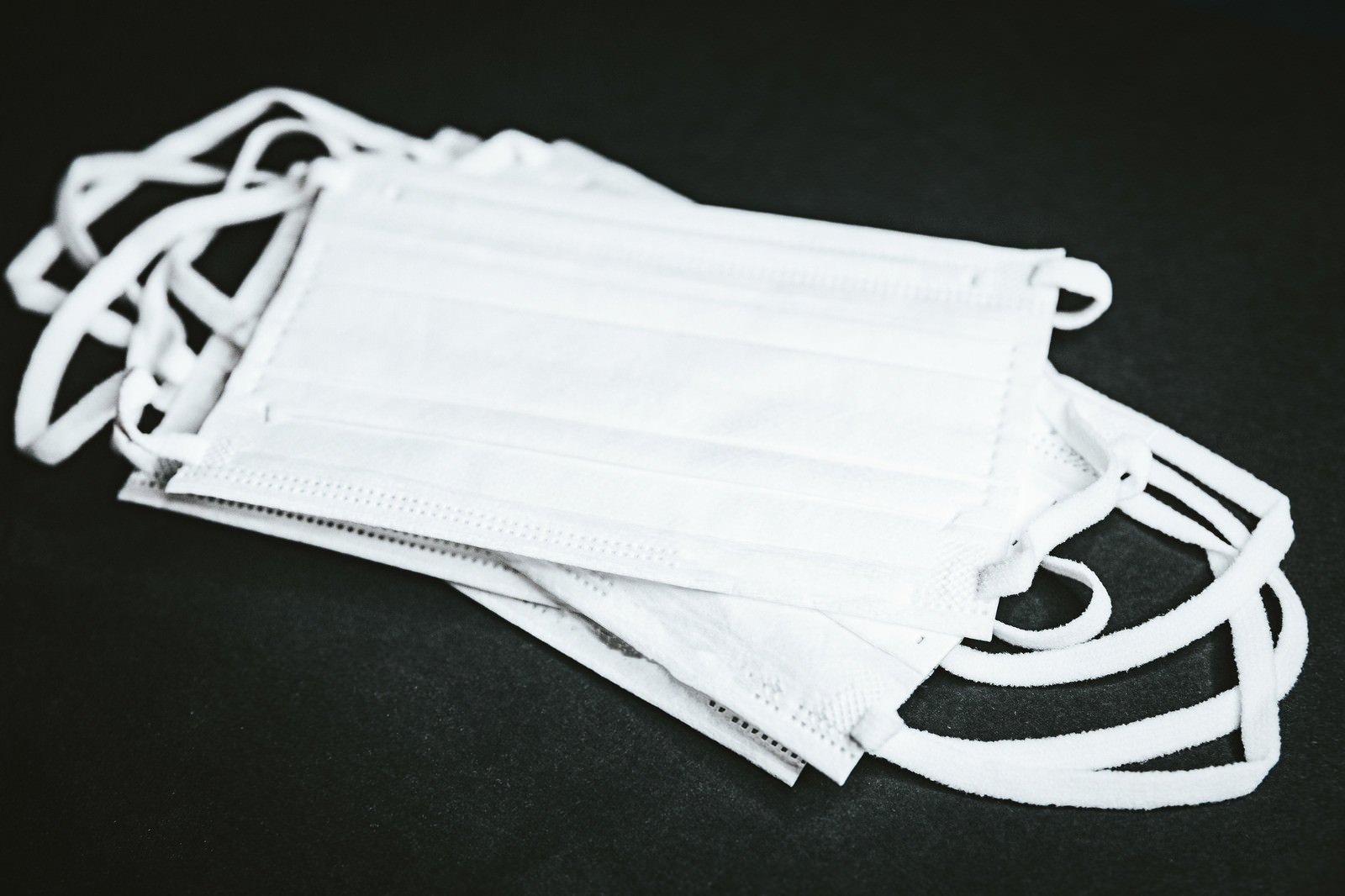 白いマスクの写真素材です。複数枚の使い捨てマスクが白い紐付きで重ねられており、パンデミック時期の備蓄状況を表現しています。感染予防や風邪対策、医療関係の資料や感染対策の案内、ウイルス対策やパンデミック関連の記事作成などにおすすめです。