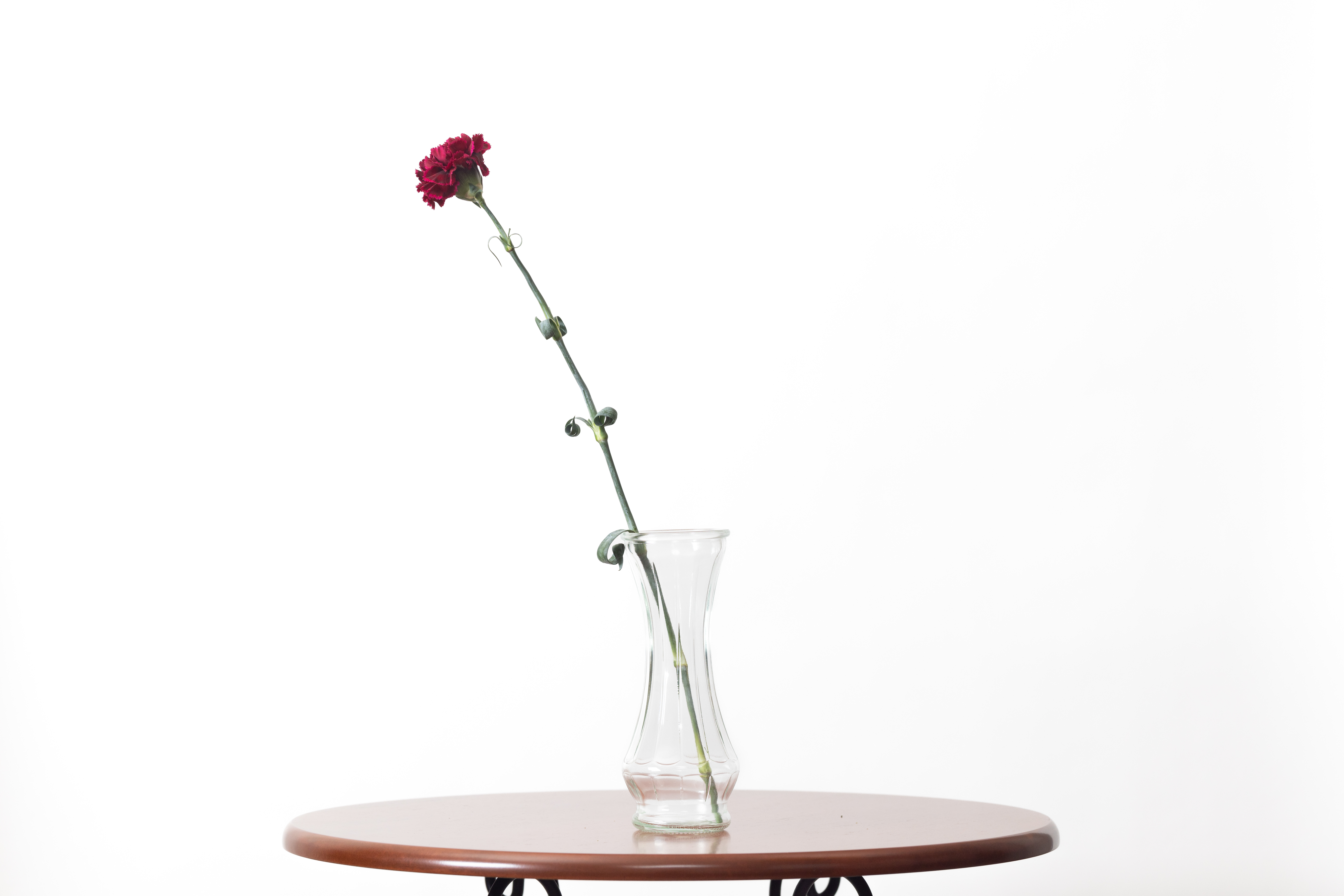 透明なガラス製の花瓶に挿した赤いバラの一輪の写真素材です。白い背景にシンプルに配置された生花で、清潔感のある洗練されたイメージを表現しており、ウェディングやフローラルデザインに最適。インテリアデコレーション素材としてもおすすめです。