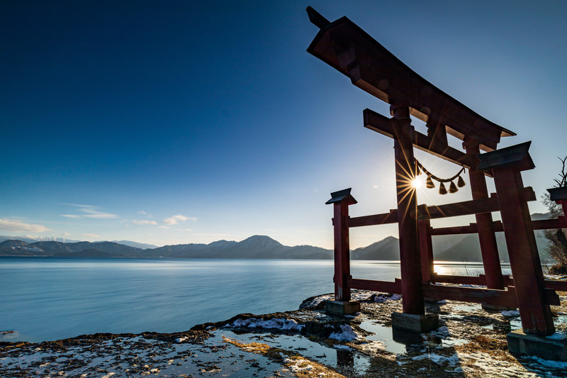 湖畔に立つ鳥居の写真素材です。西日が差し込む中、青空を背景に鳥居がシルエットとして浮かび上がり、湖面には光芒が映り込んでいます。神社参拝や和風の風景写真、水面の反射を活かした構図が必要な際のご利用をおすすめです。